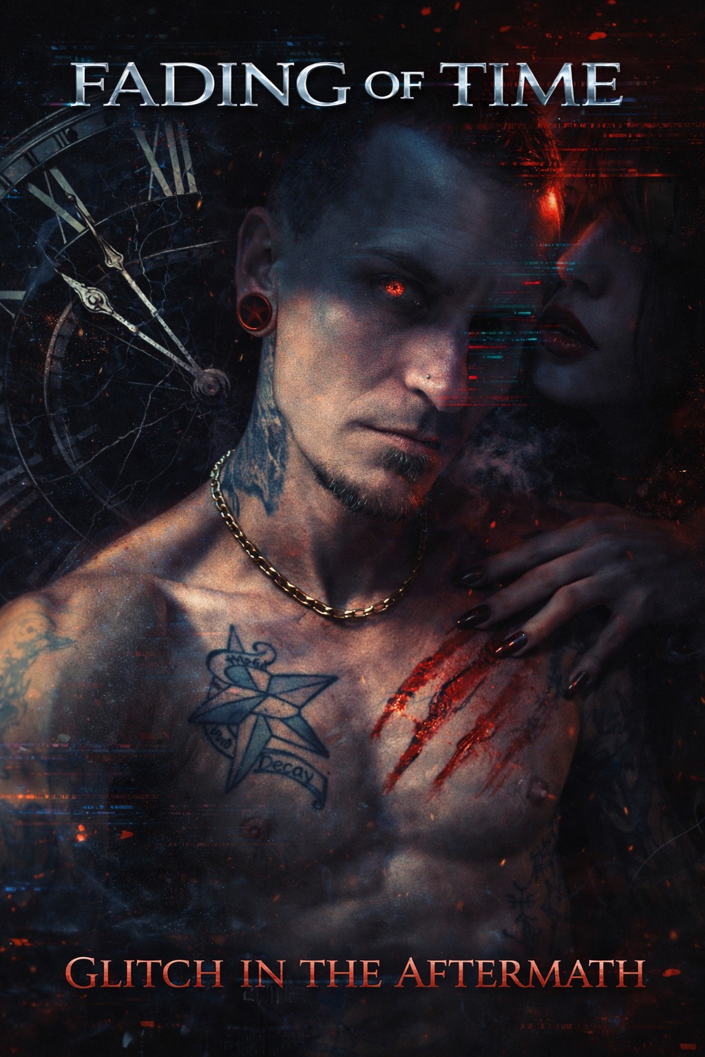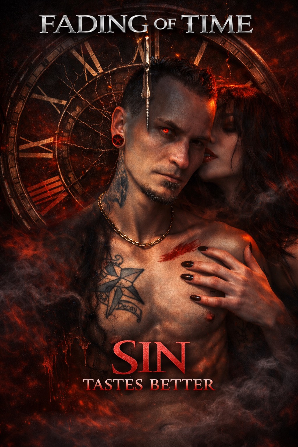 Cinematic dark-romance rock with modern electronic weight, Mid-range male vocals, smooth and controlled, emotionally charged but not aggressive, Seductive delivery with tasteful growls and breathy moans used as accents, never constant, Heavy groove-driven drums, deep bass pumps and bass punches, distorted guitars, and saturated synth layers, Subtle EDM pulse under rock, trap-influenced rhythms for movement, Glitch stutters, brief reverses, and vocal chops applied after phrases to preserve tone, Tension-heavy builds, impactful drops, risers, reverses, and sub drops, Atmosphere is intimate, dangerous, and cinematic—dark, sensual, and replayable, with power coming from production and dynamics rather than vocal force