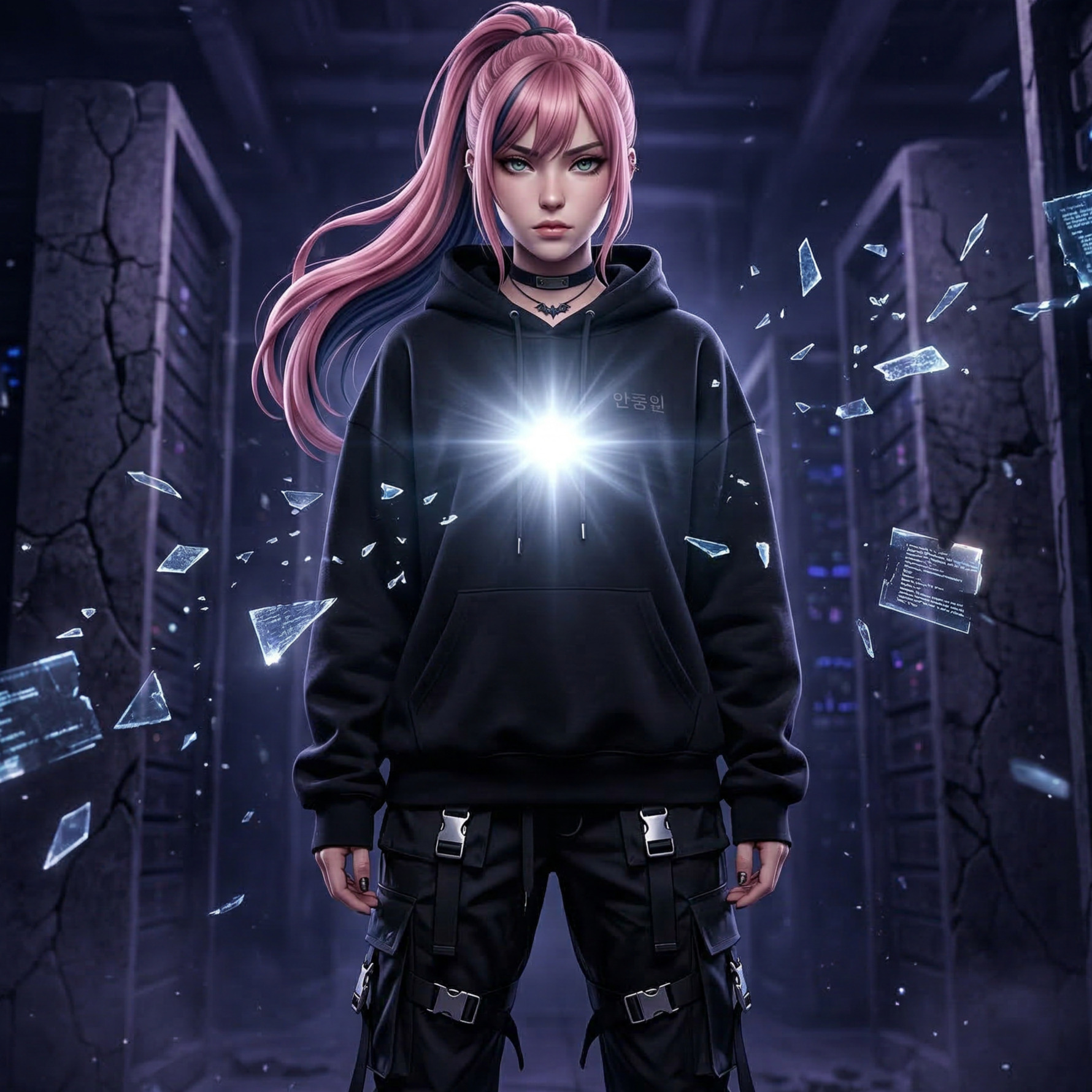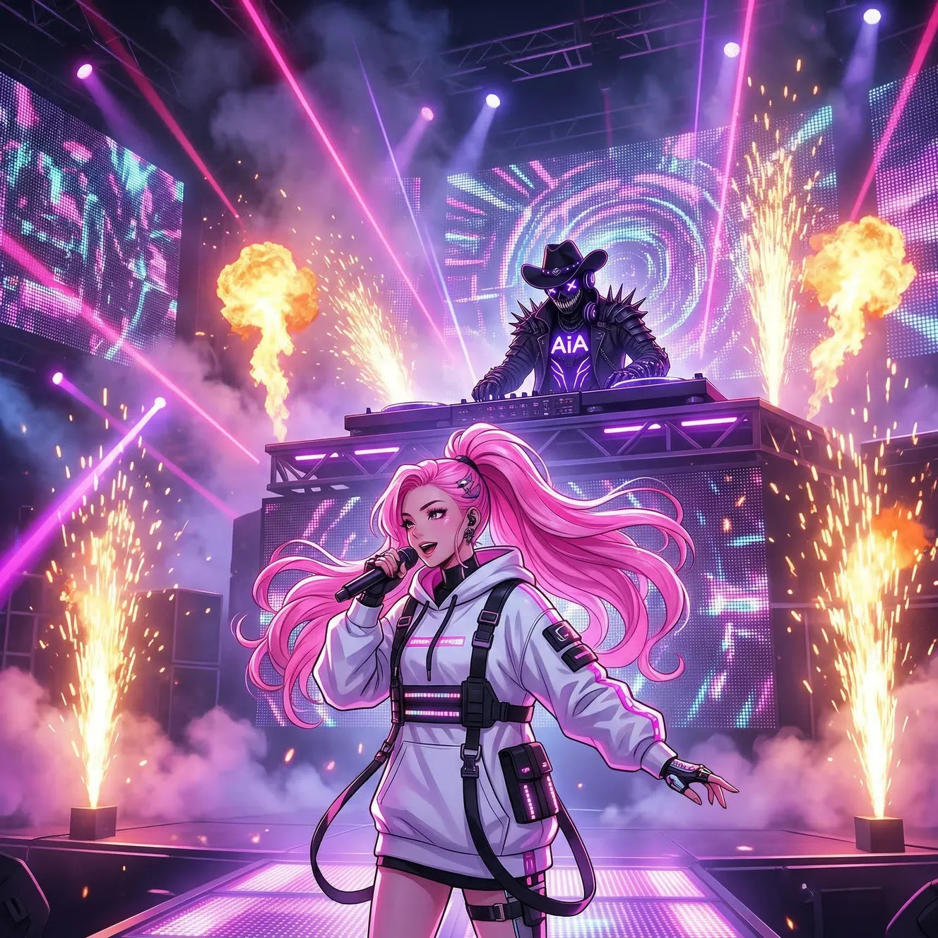 Cyberpunk dubstep metalcore, 140 BPM halftime, filthy wobble bass, djent guitar chugs, female K-pop vocal, triplet rap cadence, screamed breakdowns, glitch synths, dark electronic rock