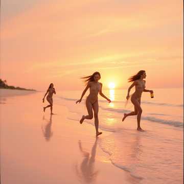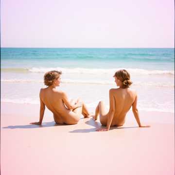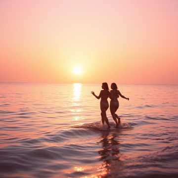 High-energy, playful pop song in 1960s Japanese J-pop style with driving disco rhythm, inspired by The Peanuts' duet in "Vacation of Love"—poetic summer flirt in German, nymphs by the sea, secret love and pink bliss days, featuring two female voices in harmony, Instrumentation: pulsating synth bass with wavy pulse, four-on-the-floor kick + bright snare/hi-hat for beach drive, arpeggiated synths with bell chimes and light strings for sunshine, clean electric guitar with chops and enka-style fills, Vocals: two young females in German—lead bright and coquettish (like Itsuko, with vibrato on "love me"), second in harmonies (like Yumiko, with echo and whispers); duet unison in verses, octaves/thirds in pre-chorus and chorus for anthemic hook on "Ferien der Liebe, " Structure: dynamic verses building tension, instrumental breaks (guitar solo + synth), choruses with repeating lift, outro with echoes, Major key, 126 BPM, clean production with reverb on vocals and synths for wave breeze
