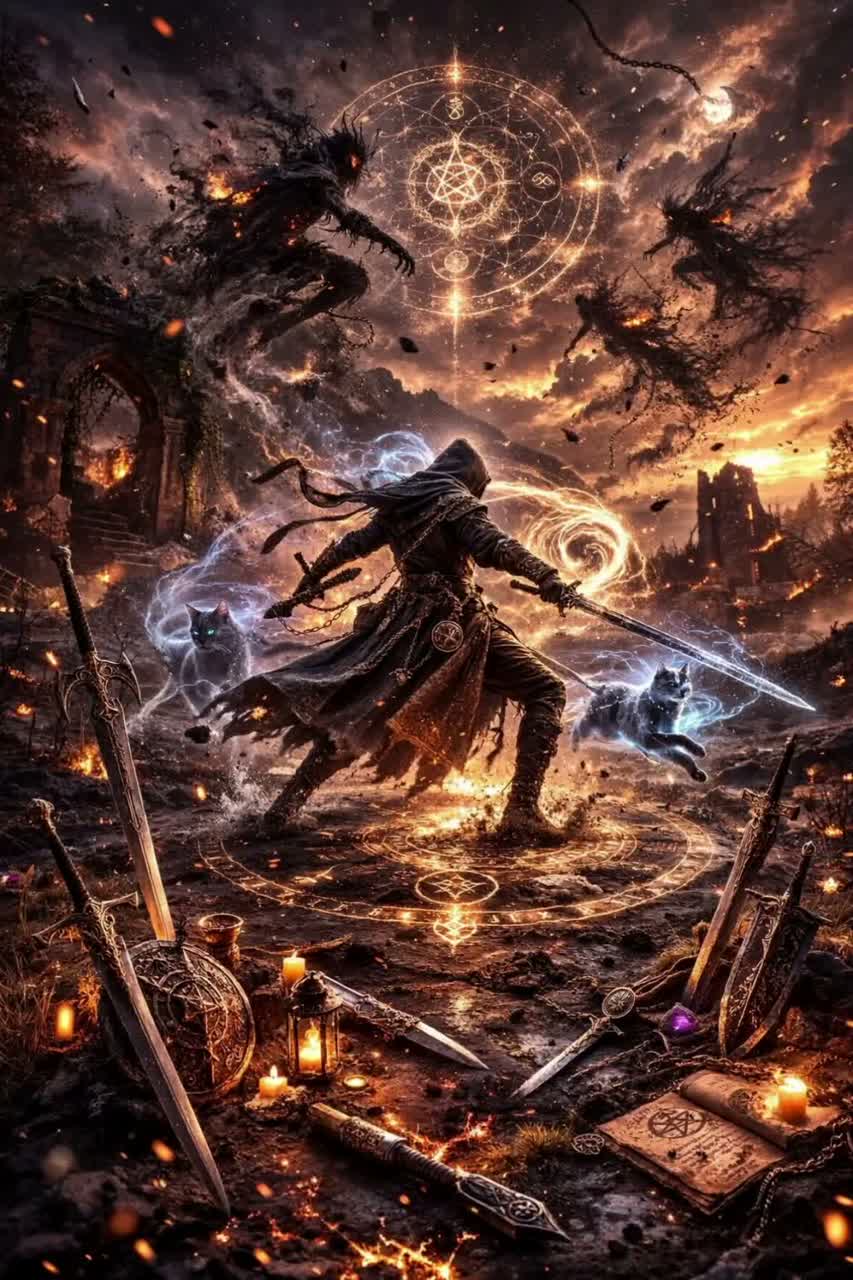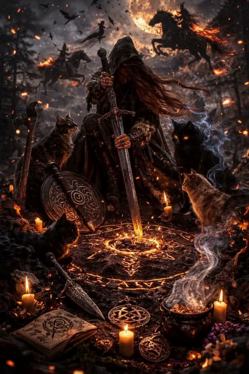 dark, orchestral fantasy score characterized by a "proud and beautiful" yet "very dark" and epic, heavy tone, It features sweeping, emotional melodies blended with intense, rhythmic, and ancient drums, creating a, demonic, and, heroic atmosphere, female Viking elven vocals