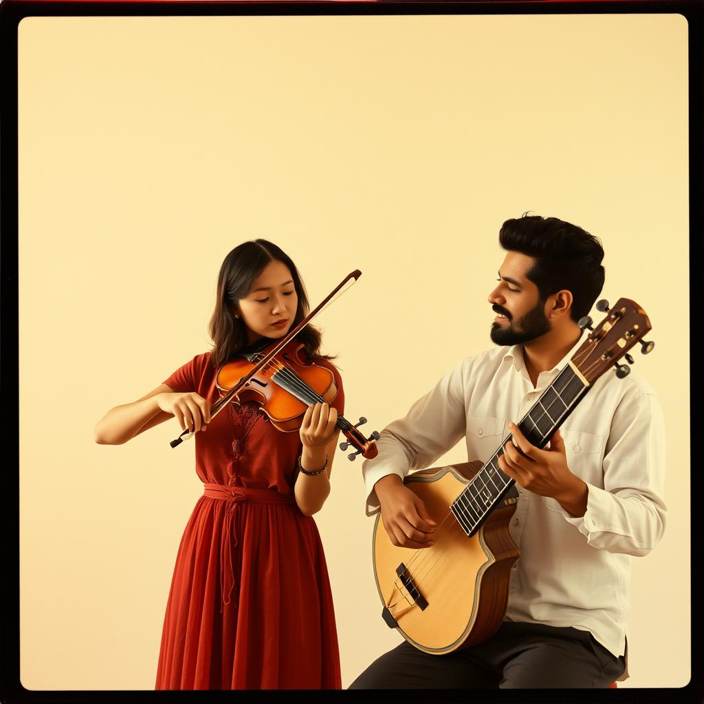 this new age string ensemble fuses motivational ethereal tones with punjabi bhangra energy at 85 bpm a solo violin opens with a breathy soaring melody in a major key evoking winds through misty valleys a cello follows with deep resonant drones mimicking a flowing river a viola weaves delicate arpeggiated notes reflecting morning dew on leaves a double bass hums a steady rhythmic pulse grounding the sound bhangra elements emerge with a lively tumbi plucking sharp twangy notes and a sarangi adding a soulful punjabi wail with rapid bow strokes subtle tabla-inspired strumming on a muted guitar string enhances the cultural rhythm reverb and delay stretch the sound into an expansive airy landscape the fusion crafts an uplifting soundscape blending nature’s serenity with punjabi vibrancy inspiring joy and connection
