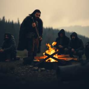 Mood: dark, tense, earthy, medieval, raw, with a short moment of celebration before the final battle, German medieval rock with powerful male vocals (rough, half-sung, half-spoken), melodic and strong chorus, Electric guitar, deep bass, bagpipes, hurdy-gurdy, driving drums, Two breaks with bagpipes/hurdy-gurdy, in between a campfire pause with a sung line from "Herr Mannelig", No synths, no brass, raw and live feel, Medieval folk and rock fusion, inspired by historic instruments and festival atmosphere