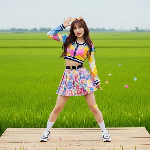 A playful and confident Korean hip-hop idol track with heavy beats and synth bass, sung and rapped by a cute and charming 20-year-old Korean female idol, Summer rural life themes, punchy rhythm, and catchy rap hooks