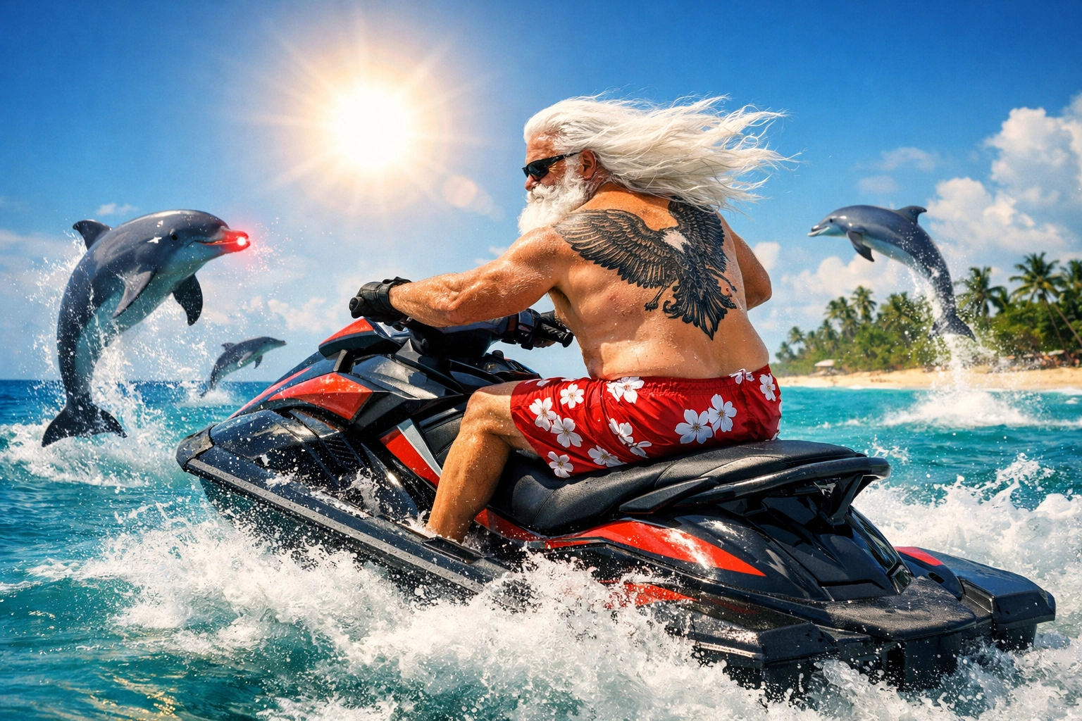 tropical metal, festive and absurd but serious tone, mid tempo, danceable groove, ukulele-driven rhythm, heavy metal drums, palm-muted electric guitars, raspy shouted male vocals, polynesian choir backing vocals, vahine-style chants, sunny vacation vibe, energetic, big final chorus