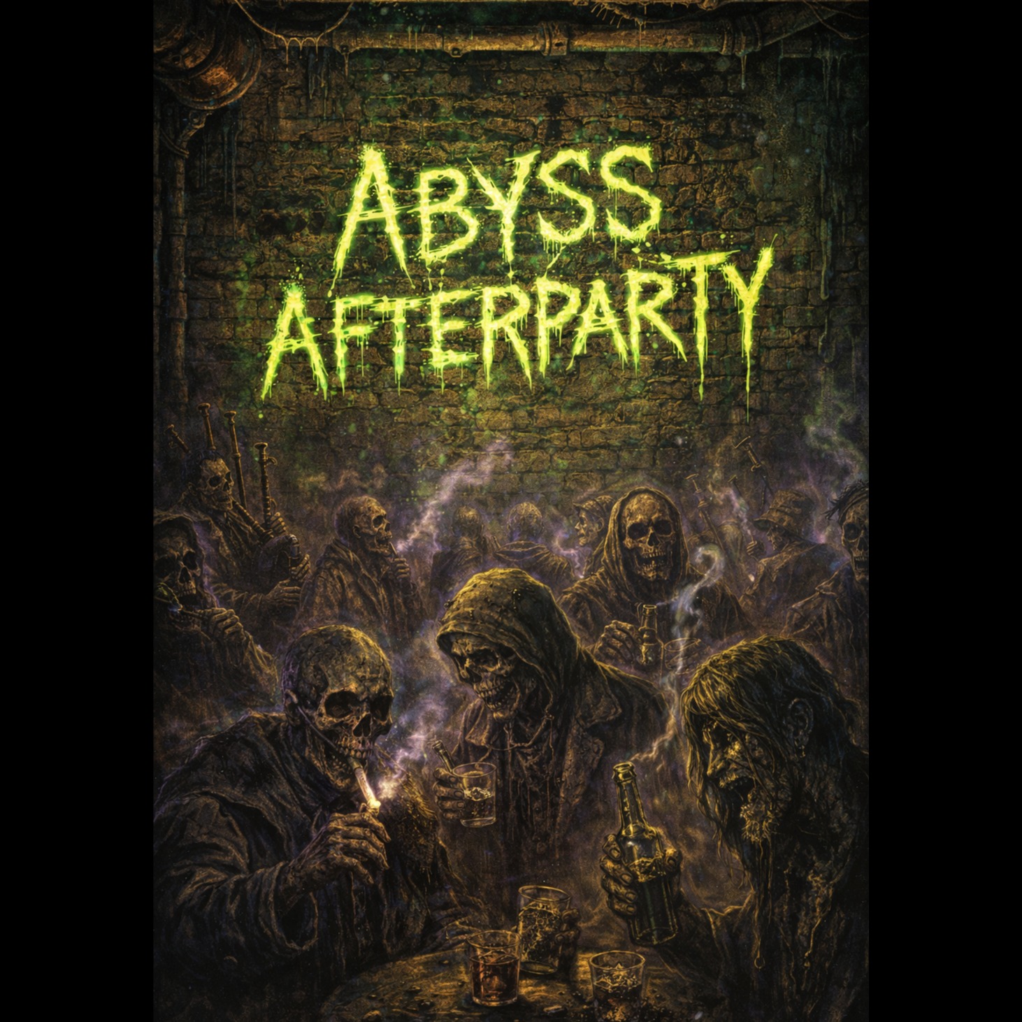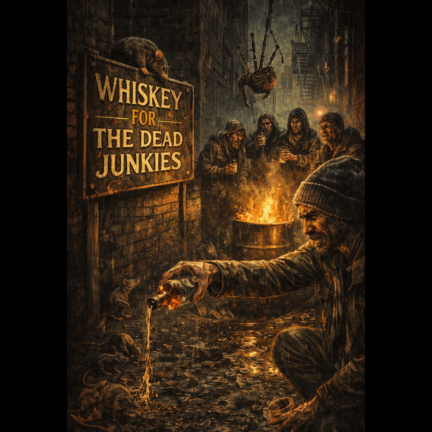 Raw southern-influenced boom-bap hip-hop at 96 BPM, gritty SP-1200 style drums mixed with Texas-style trunk-rattling bass, dusty vinyl samples, eerie tin whistle melodies and slow haunting bagpipe drones, The beat has a bouncy southern swing inspired by That Mexican OT, with heavy kicks, clacking rimshots, and dark alley ambience like dripping pipes and distant sirens, Male gritty rap vocals with aggressive storytelling delivery, lots of profanity, animated cadence, swagger and dark humor, Atmosphere feels like a drunken midnight tribute in a filthy alley, whiskey bottles clinking while junkies toast the dead under flickering neon