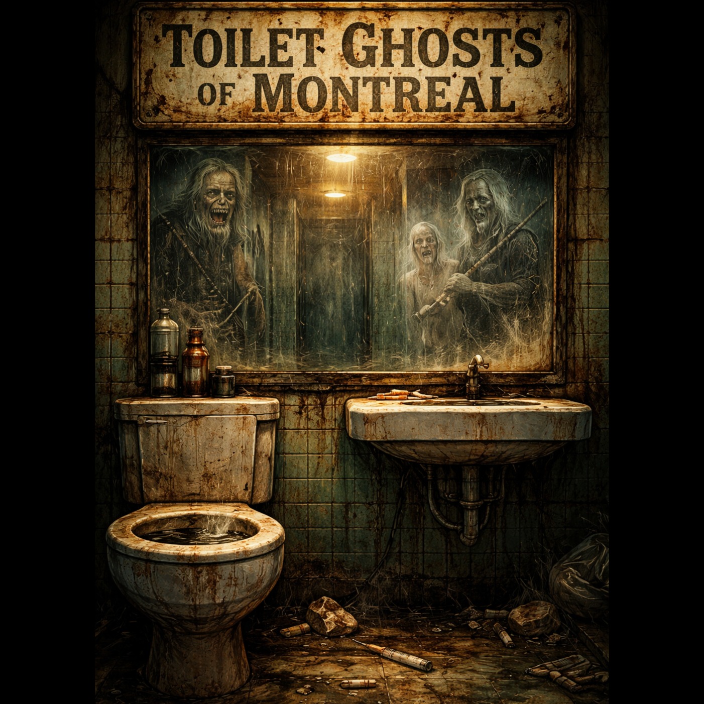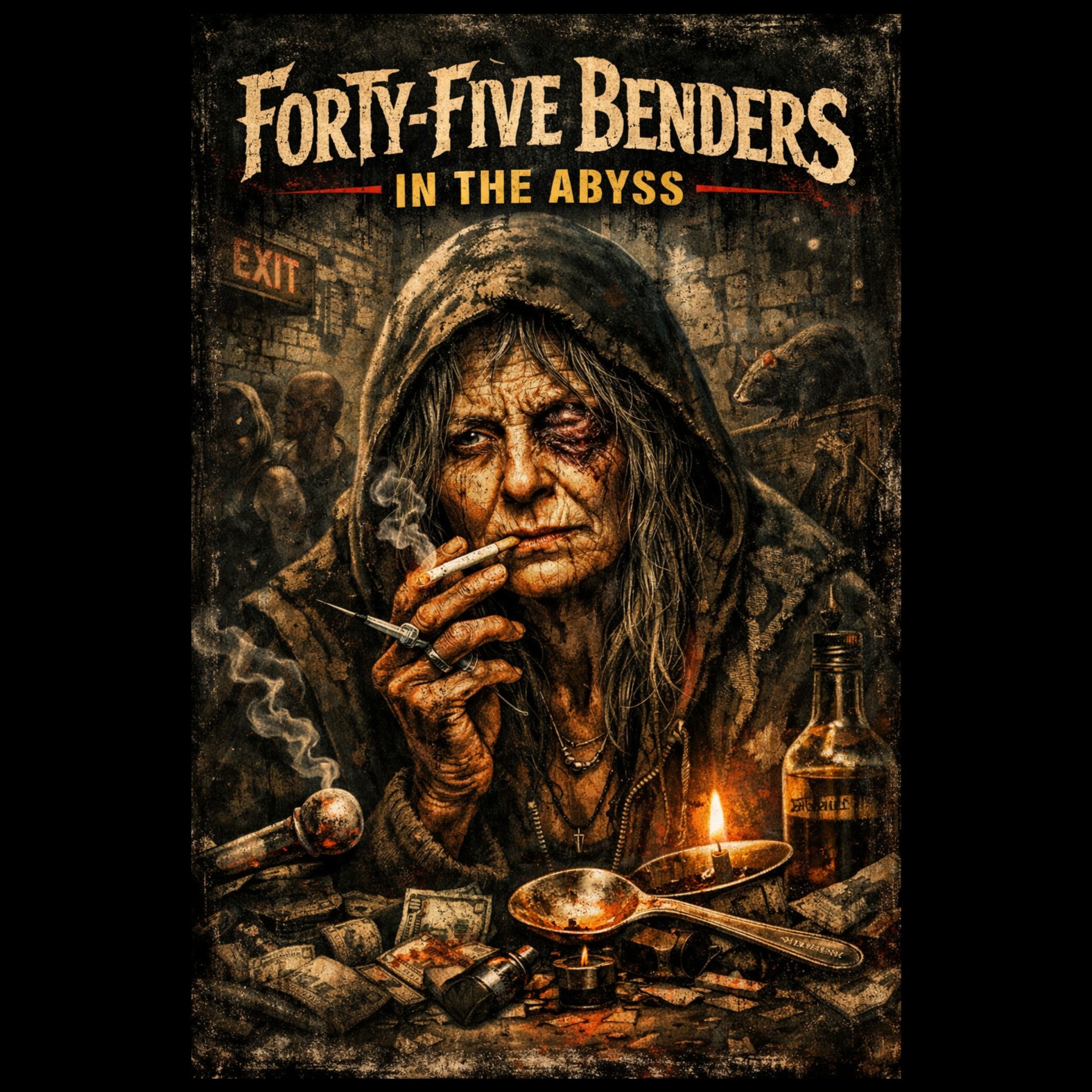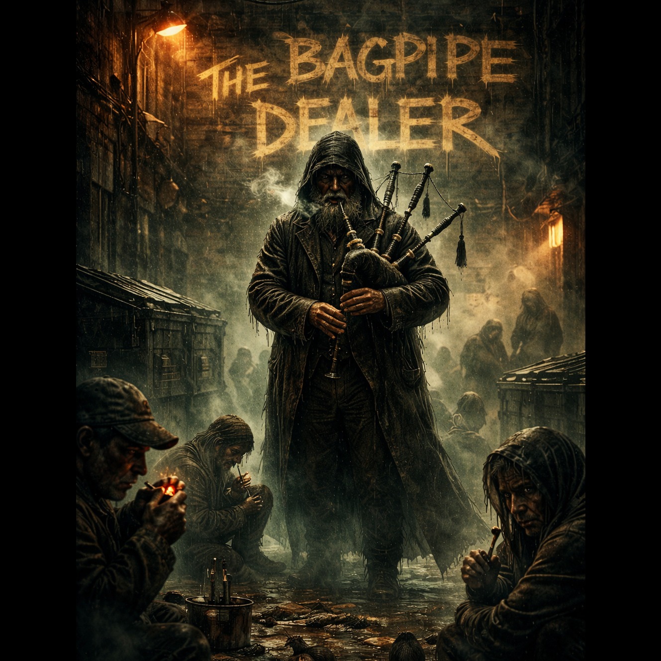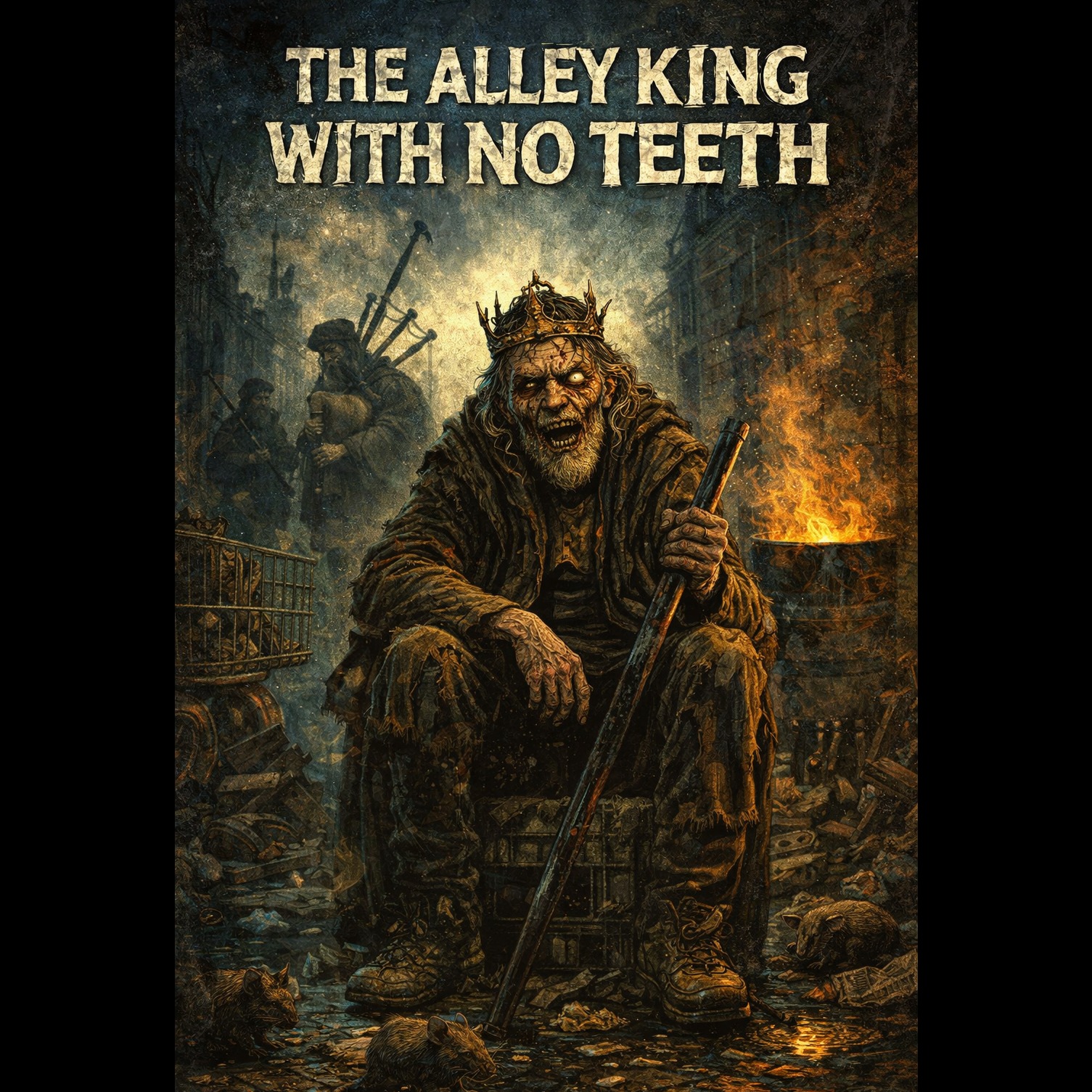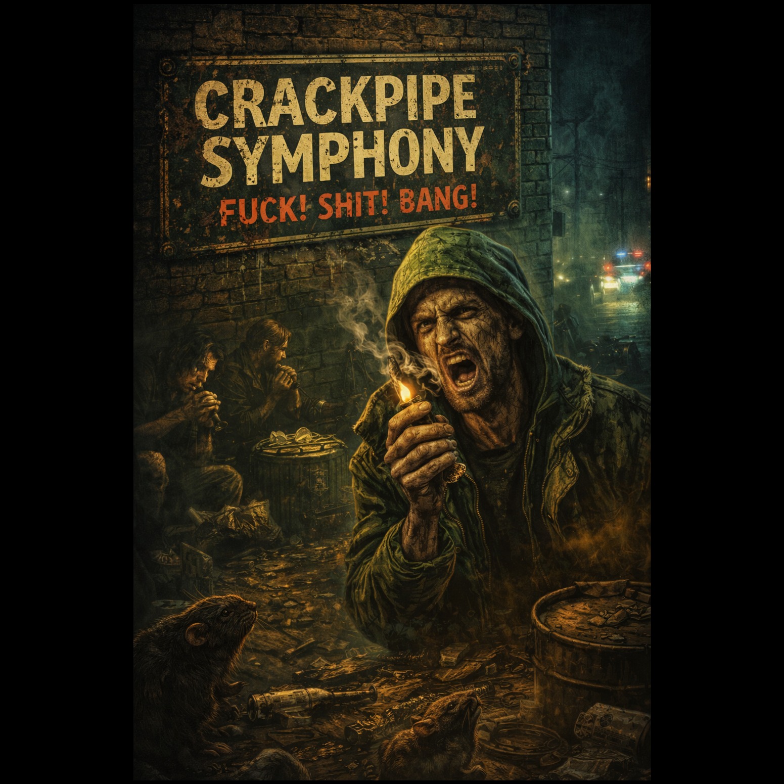 Raw 90s East Coast boom-bap hip-hop at about 94 BPM, dusty vinyl crackle, heavy punchy kick and snare, gritty SP-1200 drum feel, dark upright bass, eerie tin whistle and distant bagpipes echoing like ghosts in an alley, subtle choir pads and metallic reverb, The beat feels like a midnight street symphony: crack pipes clicking, bottles clinking, sirens howling far away, Vocal style is gravelly aggressive male rap, Method-Man-style cadence with slurred storytelling delivery, lots of profanity, dark humor, cinematic underground energy