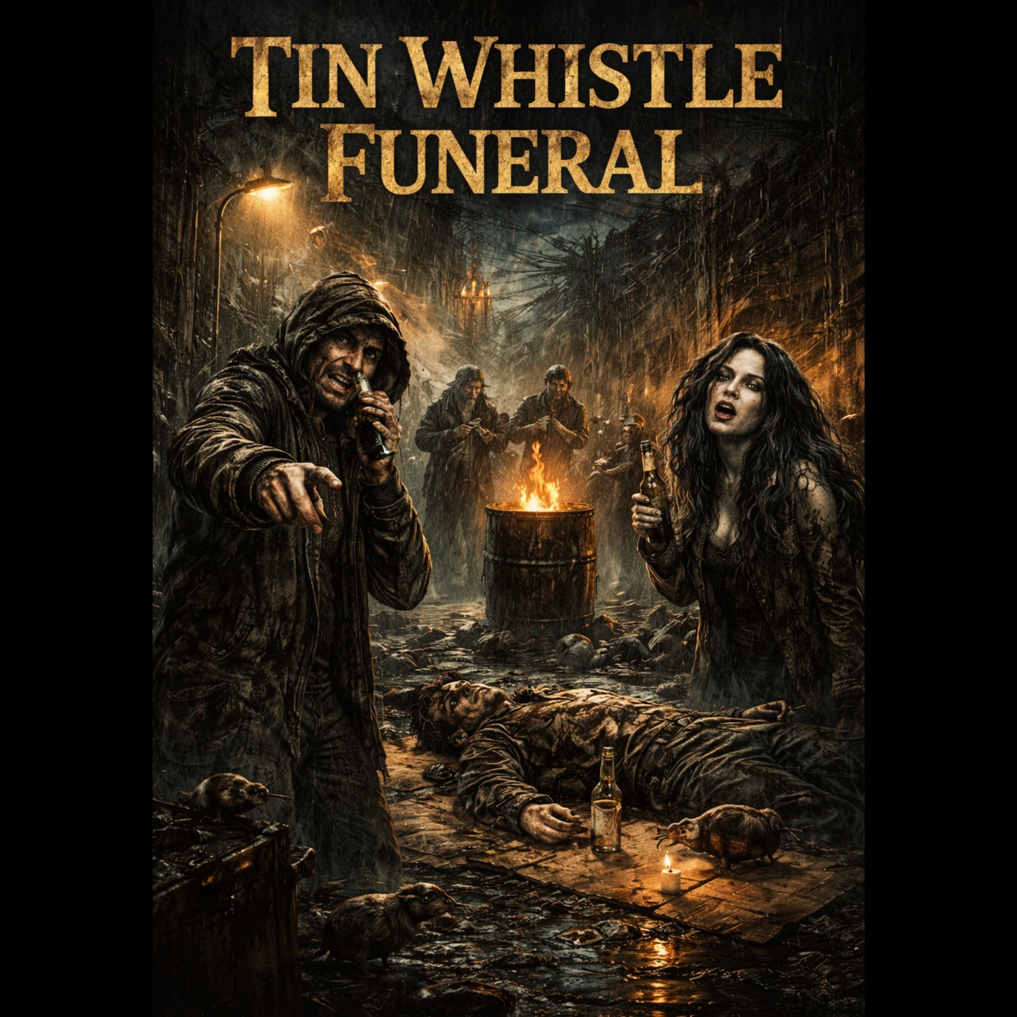 Raw 90s East Coast boom-bap hip-hop at ~92 BPM with heavy dusty SP-1200 style drums, deep grimy bass, vinyl crackle and dark cinematic ambience, Celtic funeral atmosphere driven by haunting tin whistle leads, low war drums, distant bagpipes and droning choir pads, Male gritty storyteller rap vocal with thick underground tone (Method-Man style energy) trading lines with a ghostly female vocal — raspy sarcastic female verses and eerie melodic hook, The beat feels like a drunken alley funeral procession: dark, gritty, mythic street folklore energy with chaotic swearing, bleak humor, and underground cipher intensity