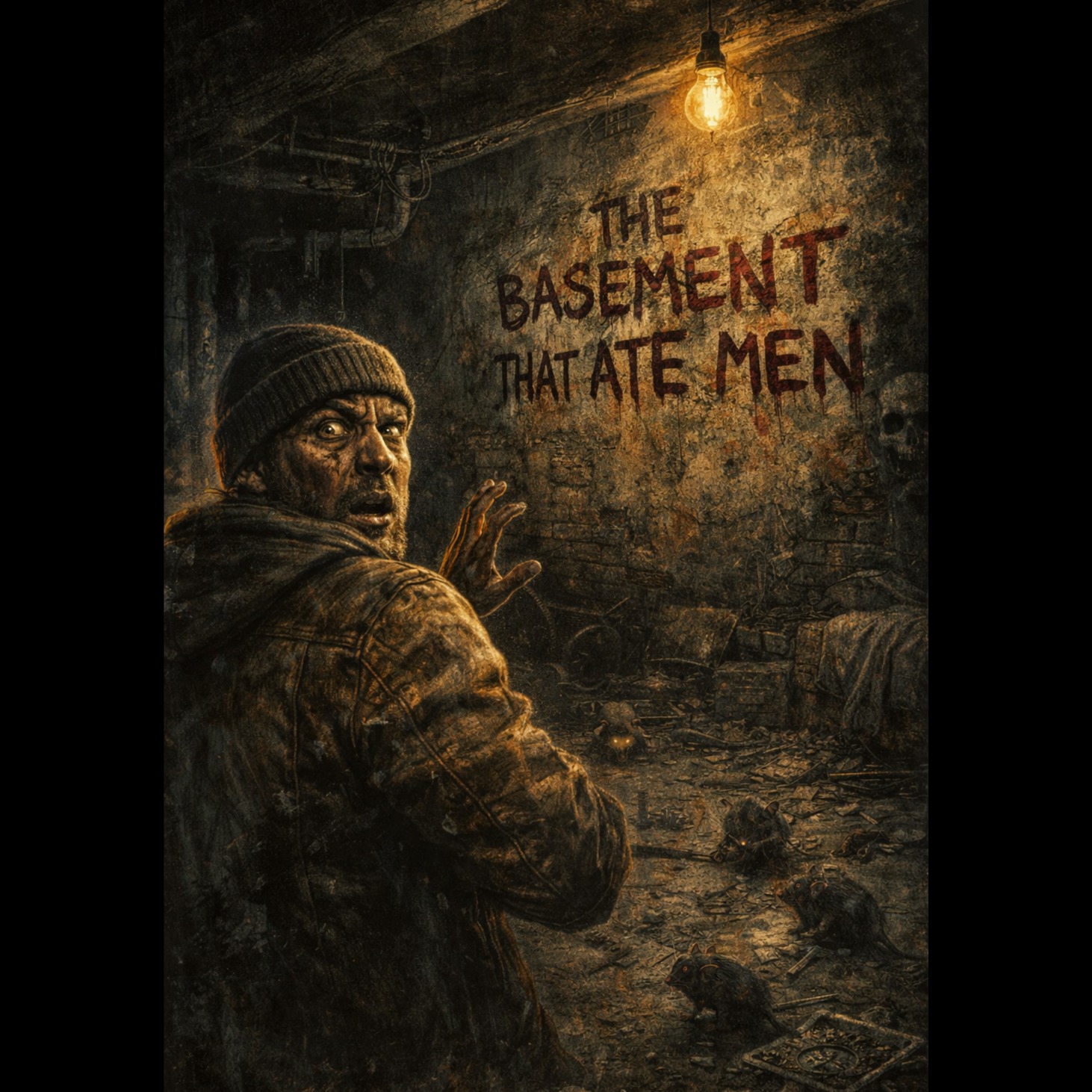 raw 90s east coast boom bap hiphop at 94 bpm dark gritty sp1200 style drums with heavy dusty kick and snare distorted subbass eerie vinyl crackle textures haunting celtic tin whistle melodies and distant droning bagpipes layered with low wardrum hits and cavernous reverb cinematic underground horror atmosphere like a cursed basement beneath a forgotten bar gritty gravelvoiced male rap delivery similar to hip hop, East Coast hip hop, hardcore hip hop storytelling style tense pacing with escalating panic and paranoia as the narrator realizes the basement itself is alive