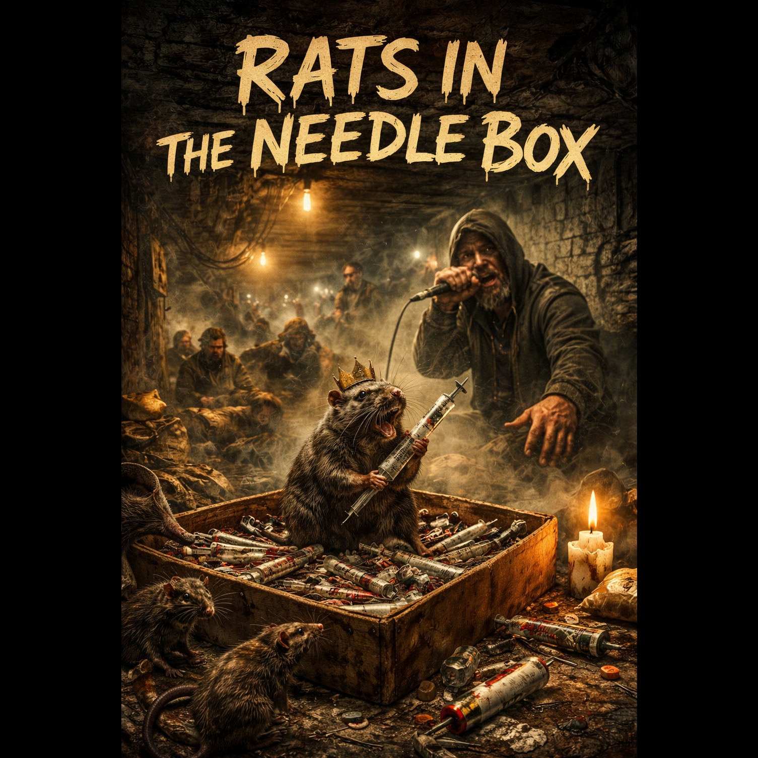 Dark underground boombap-reggaeton fusion, ~98 BPM, Heavy dusty boom-bap kick and snare layered with a slow gritty dembow rhythm, deep distorted bass, vinyl crackle, eerie Celtic tin whistle accents, distant bagpipes and echoing alley ambience, Raw aggressive male rap vocals with a raspy storytelling delivery, lots of profanity and street energy, The vibe is grimy, sarcastic, and cinematic — like a cursed underground cipher happening in a filthy basement where junkies, rats, and ghosts move to a slow hypnotic reggaeton bounce
