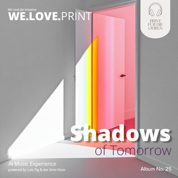 A 1980s-inspired uplifting pop-rock anthem with bright electric guitars, warm synth pads, live drums with reverb, and rhythmic basslines, Vocals are expressive and emotive: male and female voices trade melodic lines, harmonize, and engage in call-and-response with the audience, Choruses are wide, stadium-ready, layered with harmonies, subtle sax accents, and airy synth textures, The arrangement combines reflective moments with euphoric climaxes, emphasizing hope, connection, and the timeless emotional resonance of print, Mood: inspiring, forward-looking, emotionally warm — portraying printed material as a bridge to shared human experience and a brighter, connected future, Title: “Shadow of the Future”, ‑EDM, ‑Trap, ‑Lo-fi, ‑Grunge, ‑Harsh Noise