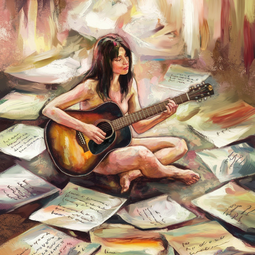 Acoustic Raw, emotional, intimate, acoustic guitar, female vocals, folk, bedroom recording, minimal production, 82 BPM, fingerpicking, natural voice, night ambiance, slight imperfections, warm tone