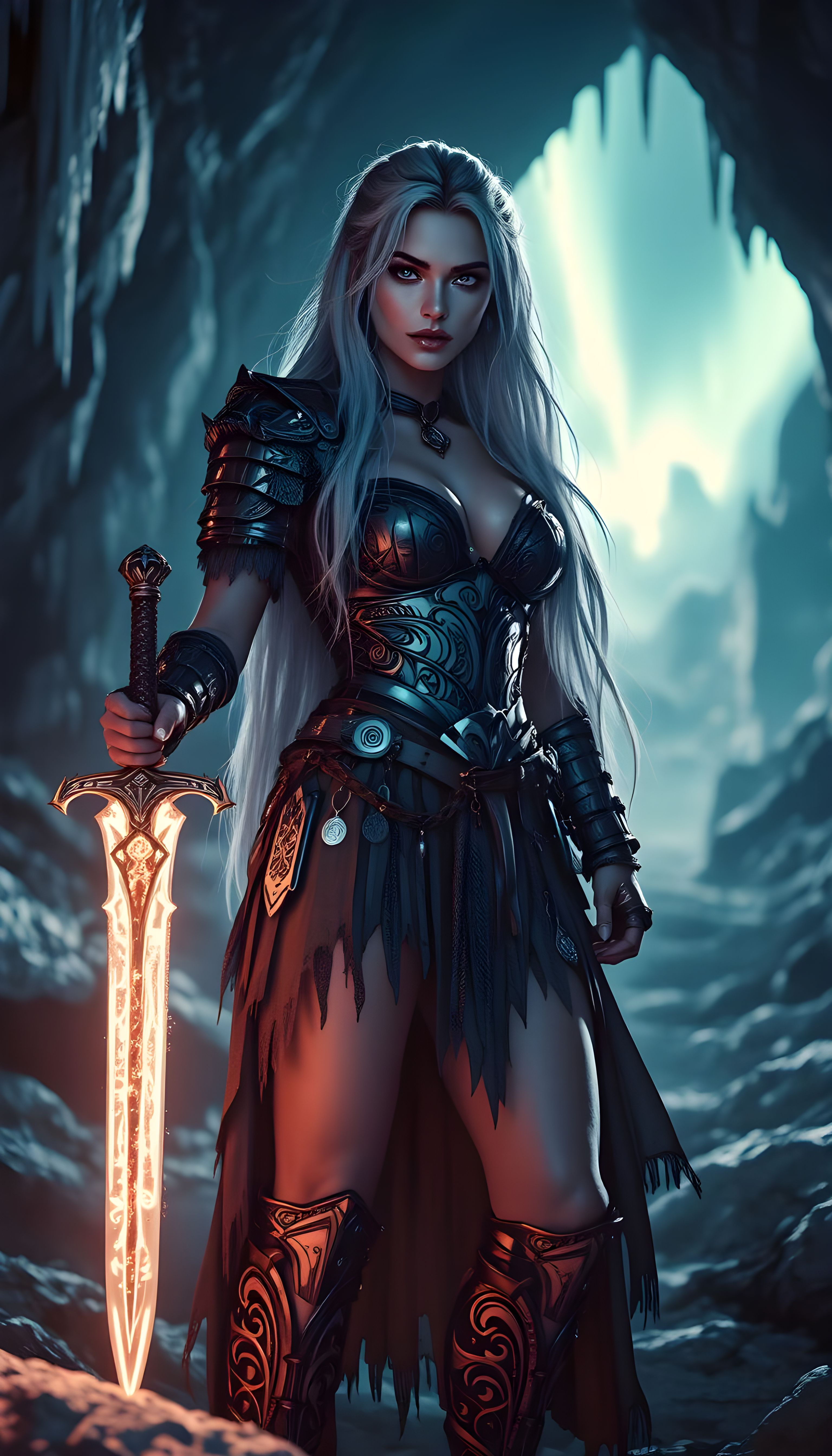 power metal, fast, deep, thick female voice, strong guitar sound, fast drums, strong horns, powerful bass playing
