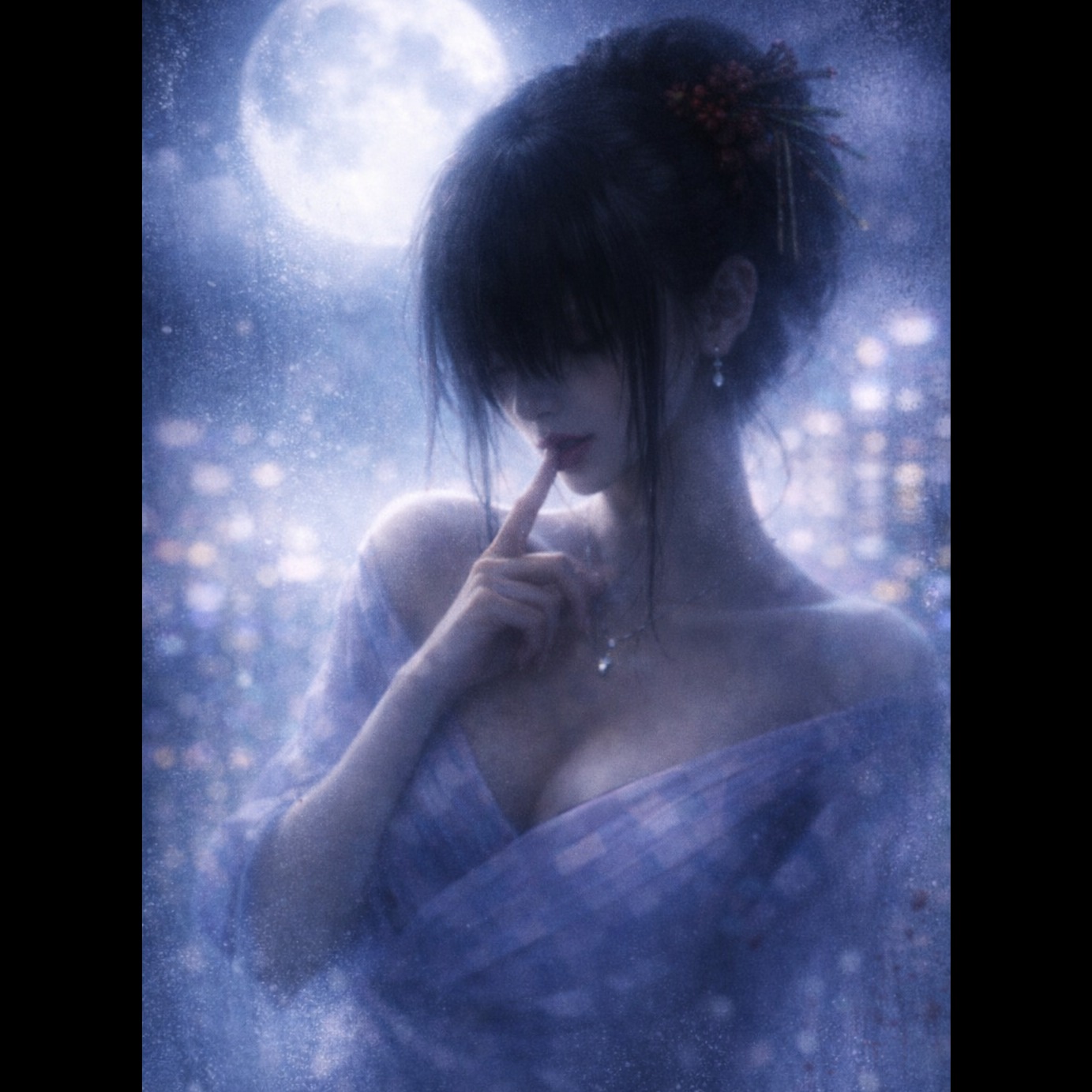 Delicate female vocals glide over lush, melancholic J-pop chords, Soft electronic beats, subtle synth pads, and gentle reverb evoke a moonlit night, Traditional koto melodies weave with clean, emotive guitar lines, while sections introduce restrained oriental metal riffs for dramatic flair