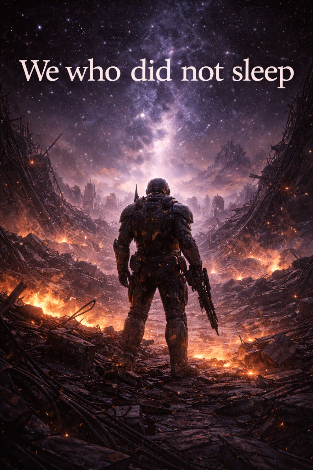 An epic, sorrow-scorched orchestral rock lament sung by a deep, emotional male voice with gritty, restrained power, Slow 4/4 tempo, minor key, heavy low strings, distant war drums, and distorted electric guitar rising during the chorus, Haunting choirs echo like the voices of the lost, The tone is tragic yet defiant, as if a lone survivor watched the sky burn and carries the memory of those he could not save, Atmosphere should feel ancient, starless, and heavy with ash and fire