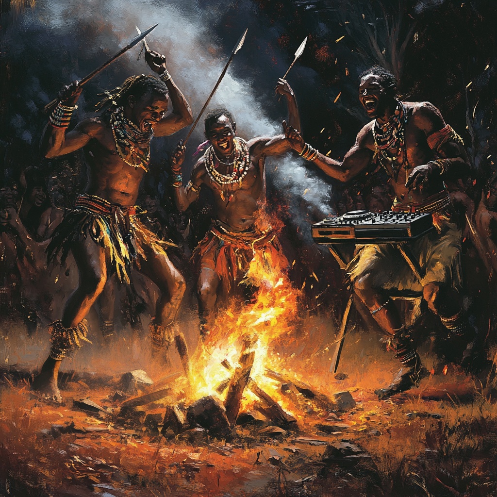jungle, dub, bongos, djembe, primal celebration, Afro-Caribbean, percussion-heavy, pulsating beats, upbeat, group chorus, savage