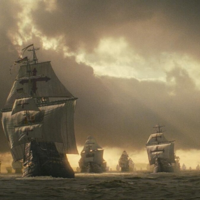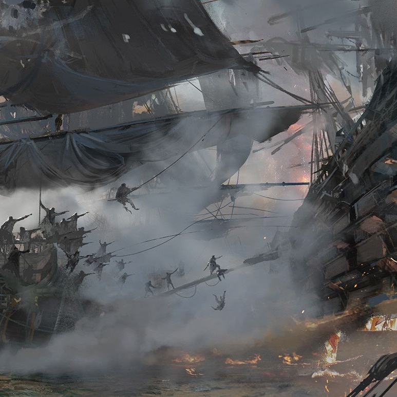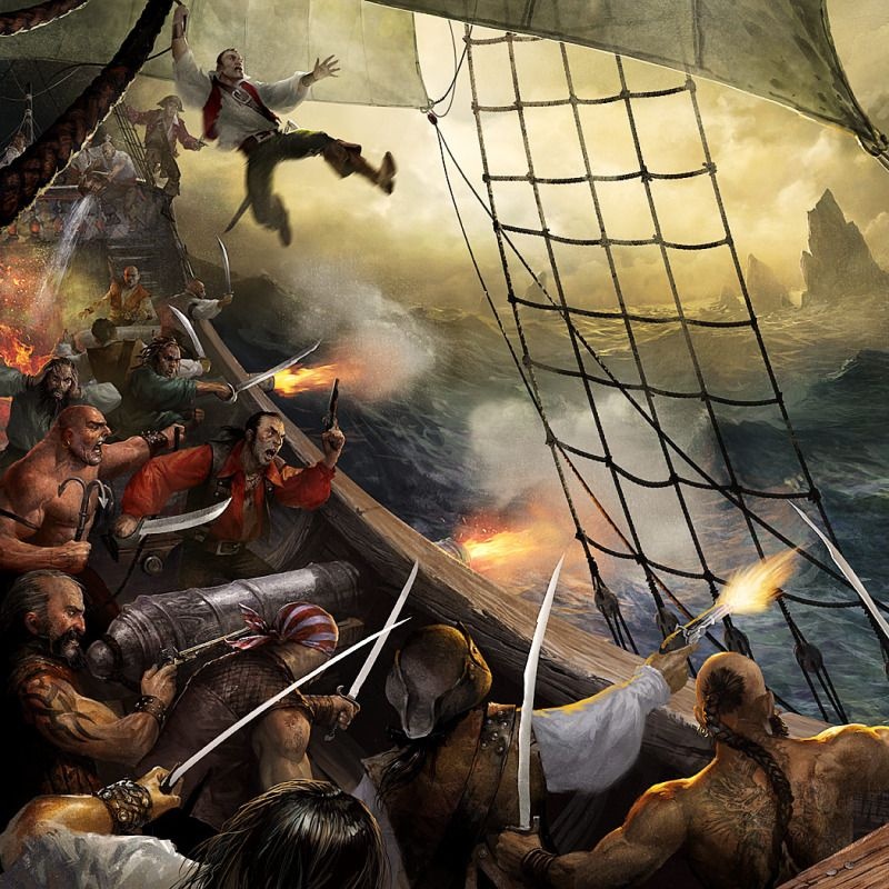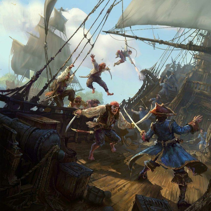 Pirate marine rock with folk and funk elements that emphasize the adventurous atmosphere and spirit of freedom, The basis can be an energetic rhythmic guitar sound with rich woodwind instruments and percussion, creating a sense of naval combat and adventure, Electric guitar with effects of riffs and strokes, creating a menacing and determined mood, Acoustic guitar — for softer moments, breeches or intros, Tambourines and cymbals — for rhythmic sea storms, a steel or wooden horn (buzz) — for marine flavor as a wind instrument, a violin or flute — for melodic inserts and harmonies that emphasize drama, Percussion: barrel, snare drum and percussion to maintain dynamics, an electric organ or accordion — for dense harmonic drawings in bridges or inter-human moments, Skeletal voice or choral inserts in the chorus to enhance the epic atmosphere