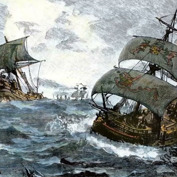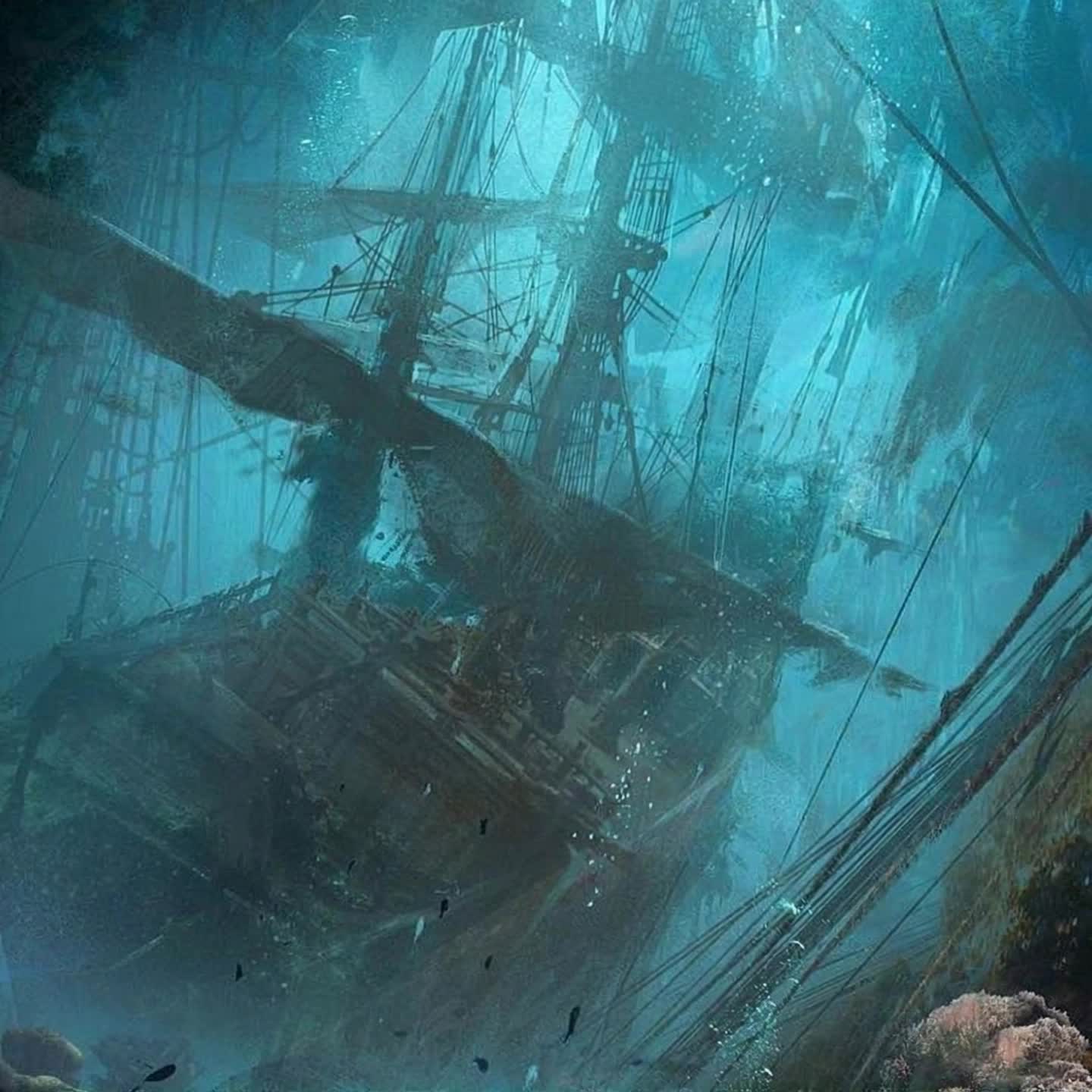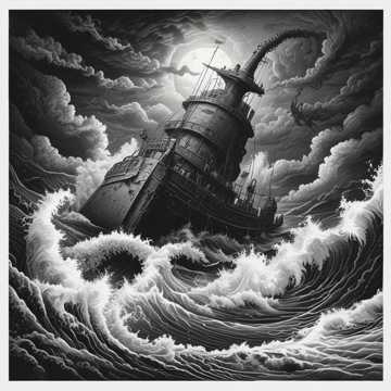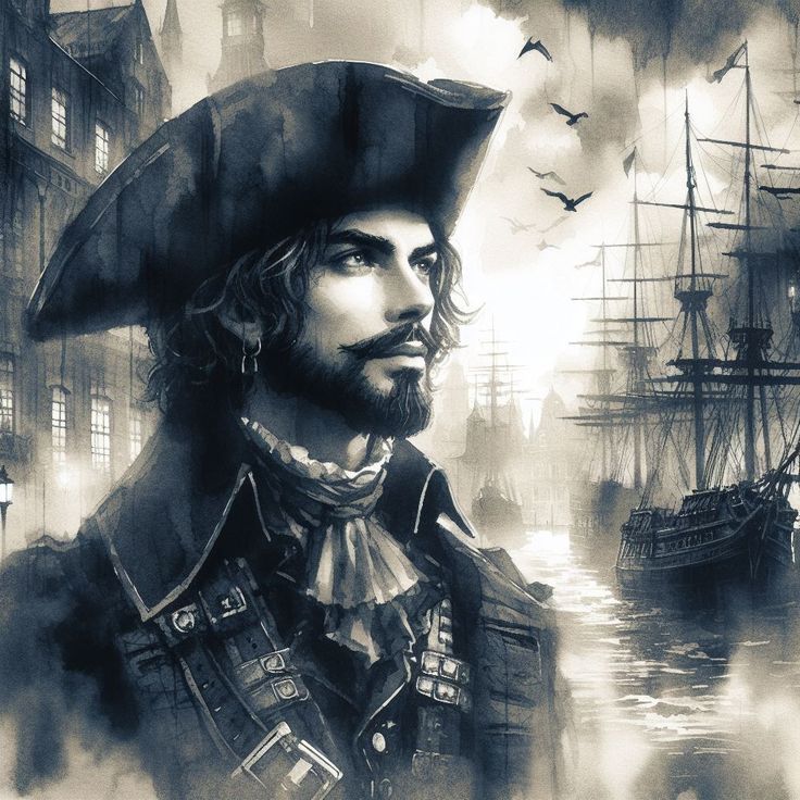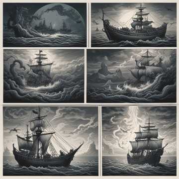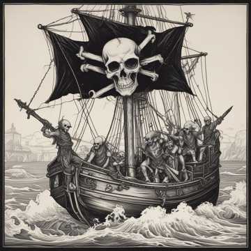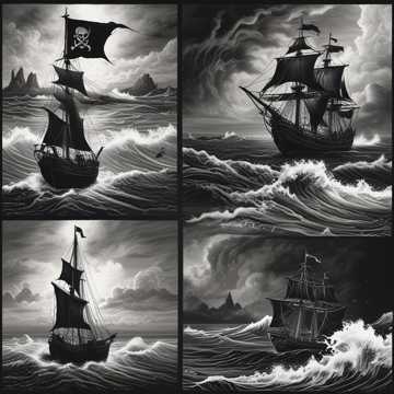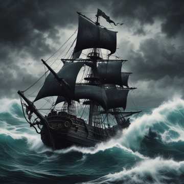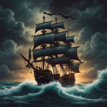 Pirate horror, a mixture of maritime tradition with elements of Gothic and church chants, characteristic marine rhythms and modernist additions to convey the spiritual and dramatic aspects of history, Arrangement: Basic rhythms: percussion like a deep barrel and small cymbal percussion, creating the feeling of a ship's storm march, Strings: low and powerful resonating instruments (cellos, double basses), to create a sense of grandeur and tragedy, Brass instruments: Saxophone or French horn for dramatization, sometimes imitating sea sounds or solemn church motifs, Keyboard: organ for a church-like atmosphere, creating a sense of grandeur and spiritual elevation, Choir: a powerful male and female choir singing in Mignon or Merzant, conveying a dramatic and prayerful element, Accompaniment: ethnic maritime instruments such as a sea flute or a violin-French horn, adding a pirate-like touch to the music, which plays on the contrast between the rugged maritime spirit and the solemnity of spi