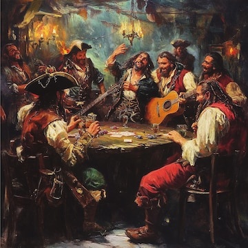 Pirate folk with elements of marine rhythmics and dynamic arrangement, Arrangement: Basic rhythm and melody: accordion or harmonica, creating a marine atmosphere and pirate mood, Bass instruments: double bass or bass guitar with rhythmic accents, imitating the sound of barrels or antique scales, Percussion: barrels, congas, maracas, creating noise seas and the roar of waves, You can add wooden sticks or rattling chains for an additional "sea" sound, Melody and harmony: violins or violas, giving a pirate folklore flavor and drama, Final emphasis: the use of bellows and percussive basses in the final movement to enhance the effect of celebration or victory, Dynamics and character: energetic, with with a marching rhythm, simulating a storm and a naval battle, At the moment of the solo, a solo harmonica or violin with a nautical motif, and the potential use of vocal techniques: powerful calls and cries in the style of naval battles, adding to the drama