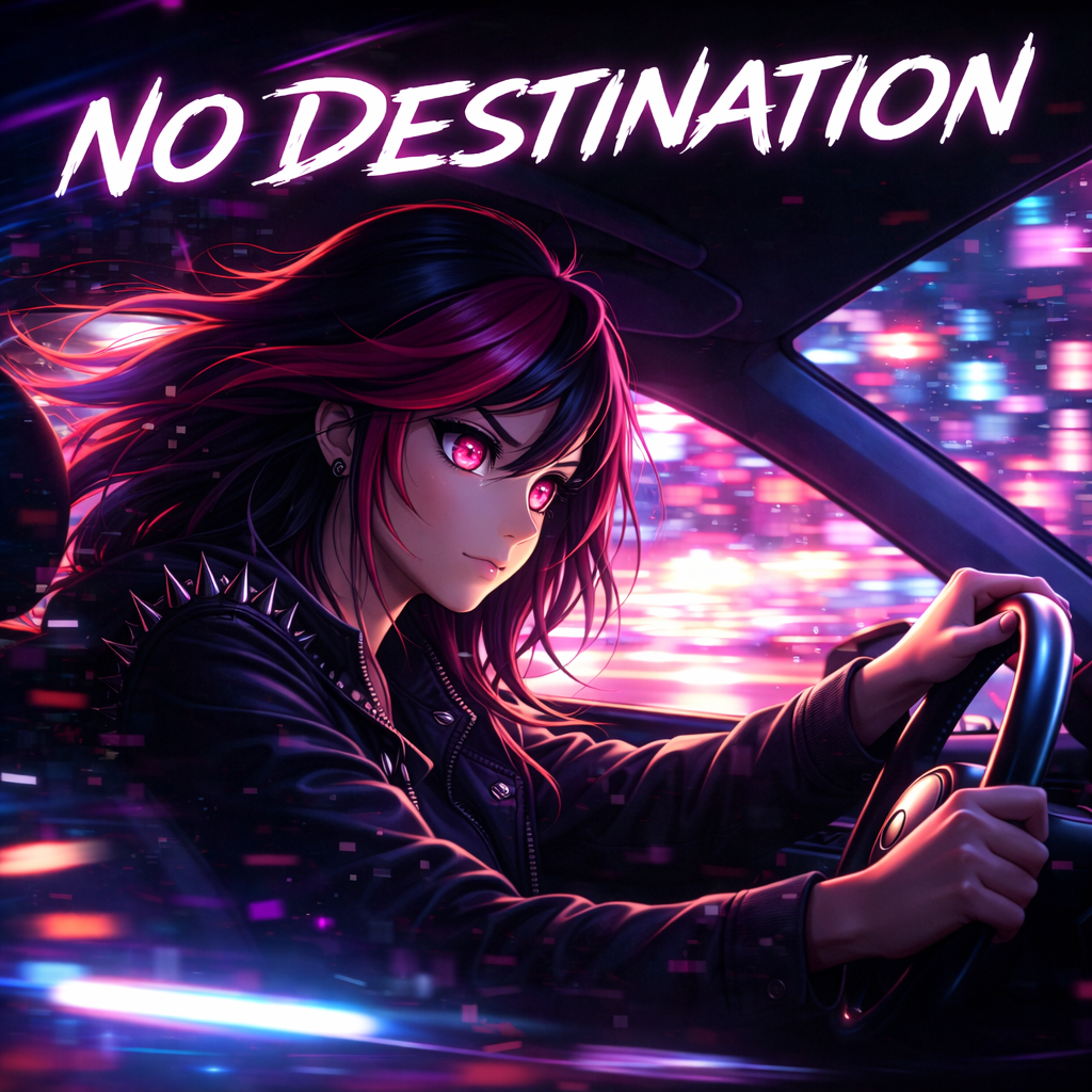 Theme: Reckless escape, moving fast to outrun everything, Mood: Breathless, impulsive, urgent freedom, Energy: High, chaotic, adrenaline-driven, High-energy, chaotic synth-rock, driving percussion, fast tempo, female vocals breathless, urgent, reckless, neon-electronic textures, cinematic motion, feeling of fleeing, night-time adrenaline, distorted bass, tension and excitement, dramatic soundscape