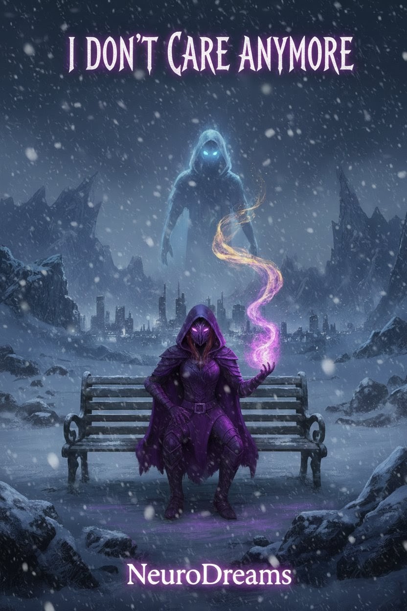 Theme: Emotional shutdown, detachment, shrugging off the world, Mood: Careless, apathetic, resigned, Energy: Mid-tempo, drifting, almost playful in detachment, Mid-tempo, apathetic electronic/ambient fusion, muted synths, soft drums, female vocals detached, monotone yet expressive, feeling of numbness and emotional shutdown, introspective, cold winter tones, subtle tension in background, minimalistic, drifting atmosphere