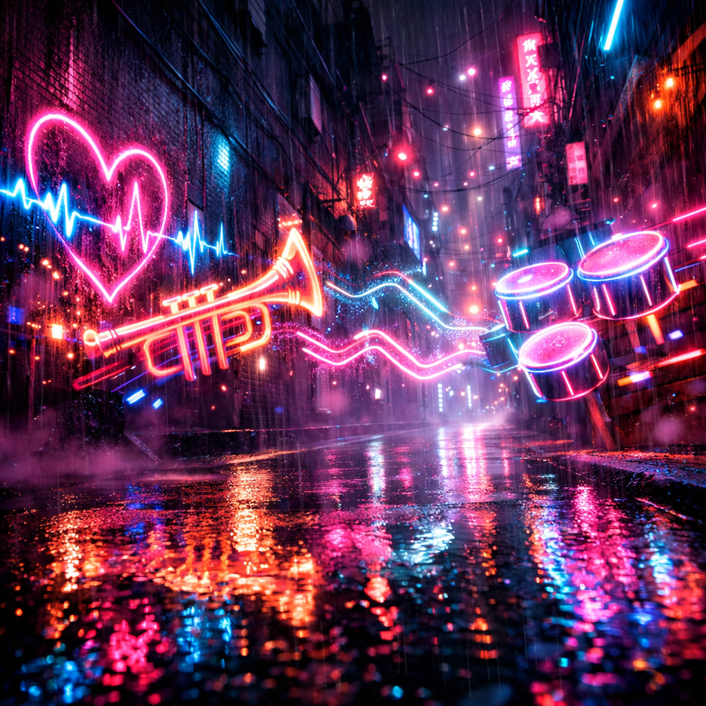 A phonk-inspired EDM track kicks off with punchy hard bass and gritty electronic textures, Layered brass—trumpet stabs and smooth saxophone licks—drive the hook, riding atop a deep, rolling bassline, Percussive samples and syncopated hi-hats energize the groove throughout