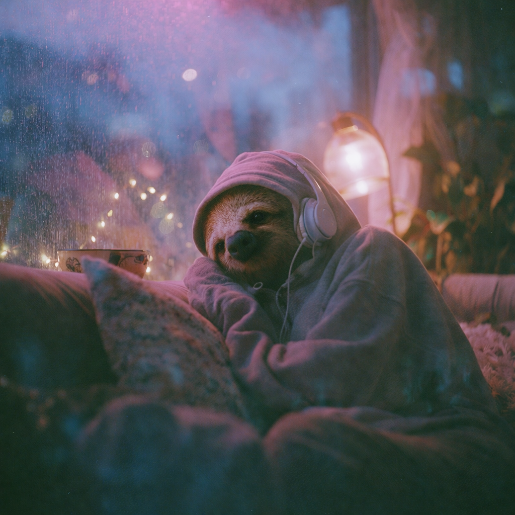 A lofi EDM track opens with hazy vinyl crackle, sparse mellow chords, and subtly chopped vocal samples, Soft synth pads layer with a stuttering, swung beat, Warm bass reinforces the groove, growing into a mellow, effect-laden drop, while textures ebb and flow throughout