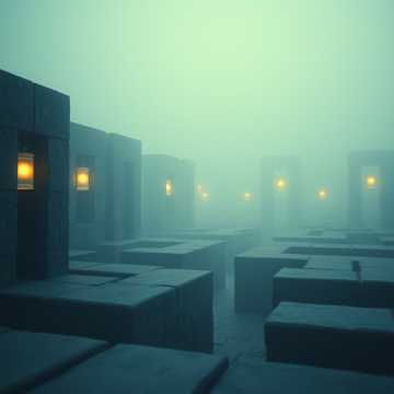 Mysterious, atmospheric, ambient electronic, haunting, slightly eerie, rhythmic undertones, subtle chimes, soft drone-like synth pads, evocative of exploring an ancient maze