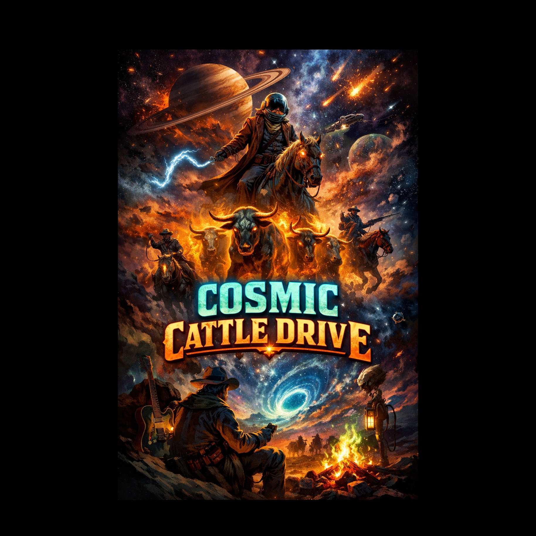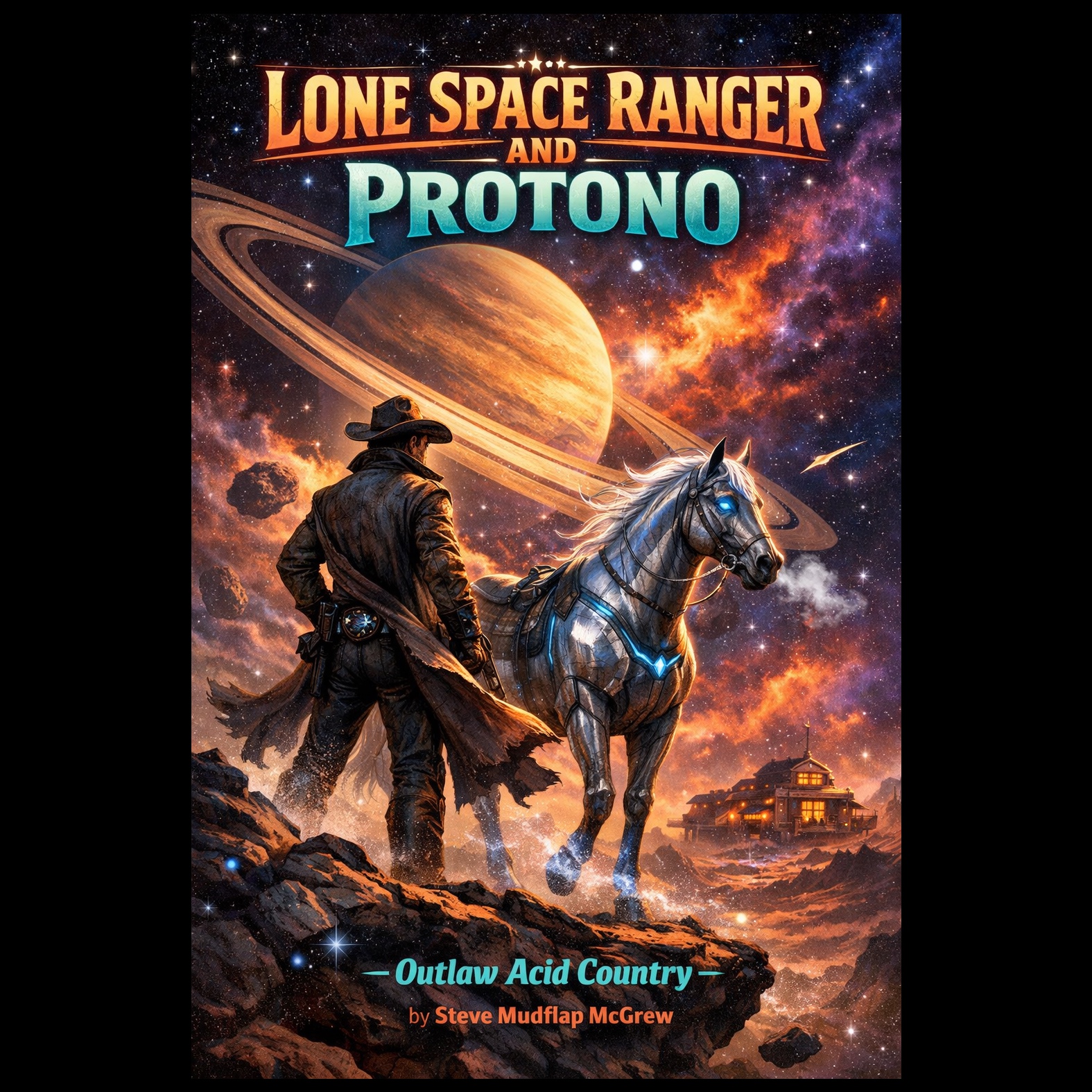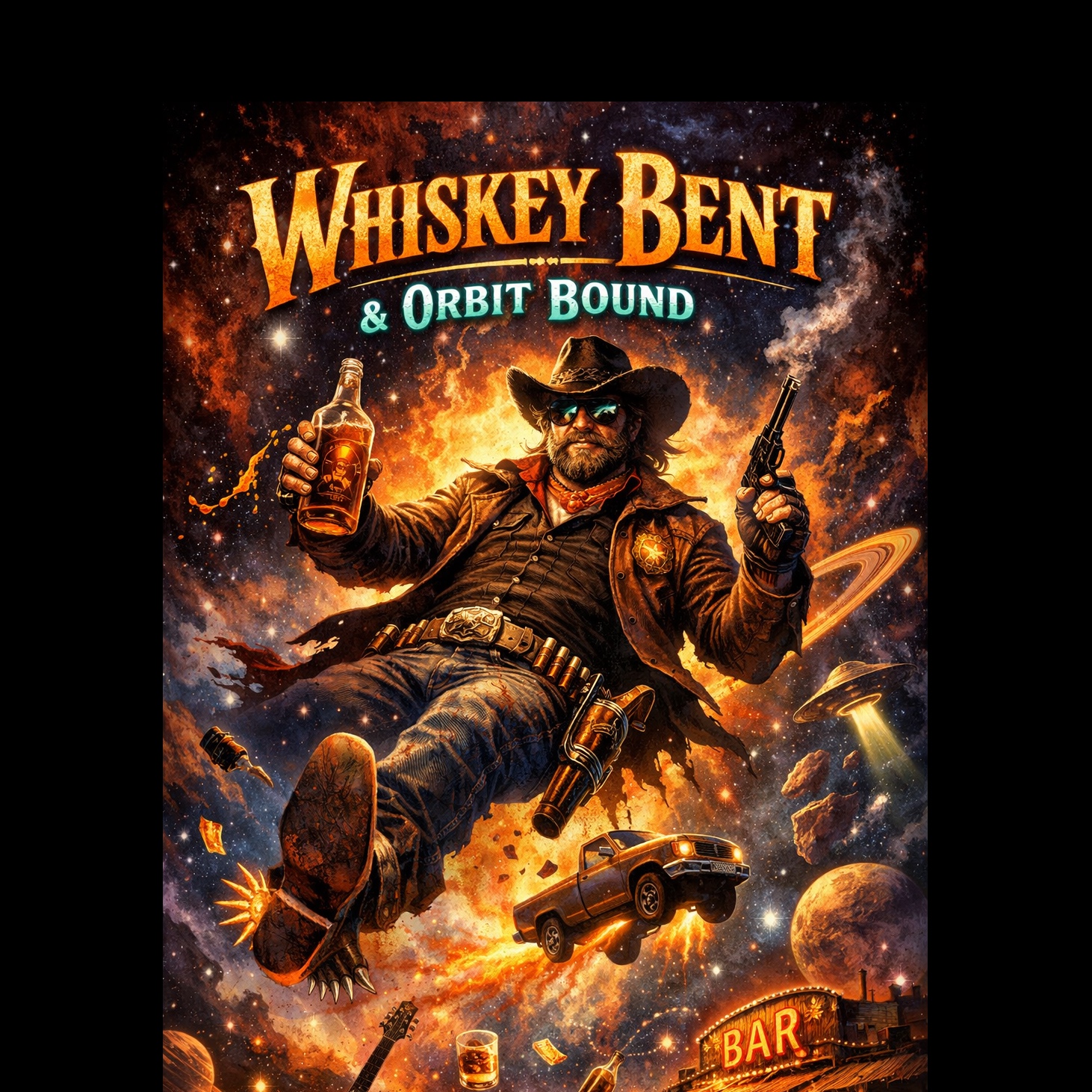 upbeat fastpaced outlaw acid country psychedelic outlaw country cosmic cowboy energy driving train rhythm twangy telecaster lead guitar fuzzy psychedelic electric guitar analog phaser effects cosmic pedal steel swells galloping outlaw country drums deep warm bass groove vintage tube amp tone spacey reverb swirling hammond organ textures dusty saloon energy mixed with psychedelic space western atmosphere energetic but mysterious sounds like Country, outlaw country, Americana jamming with a cosmic outlaw band in deep space