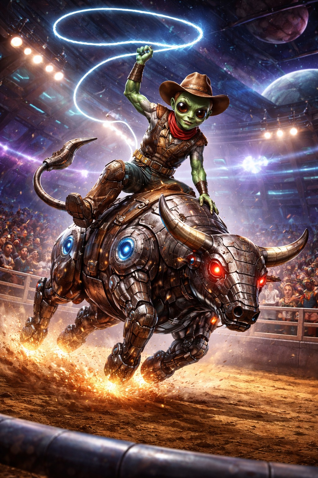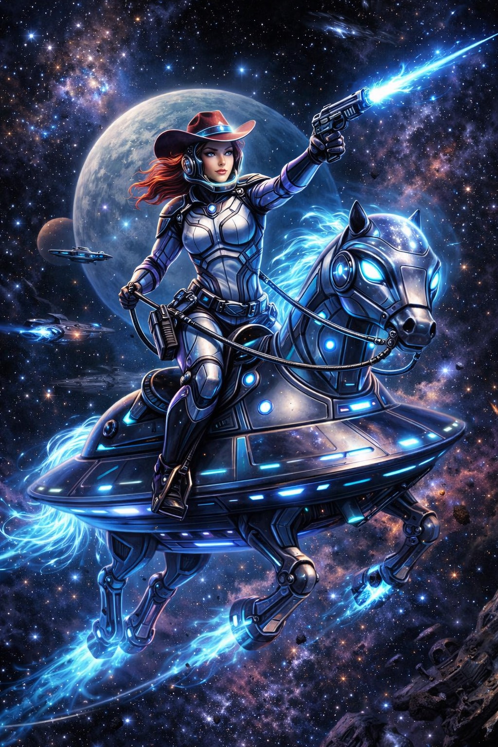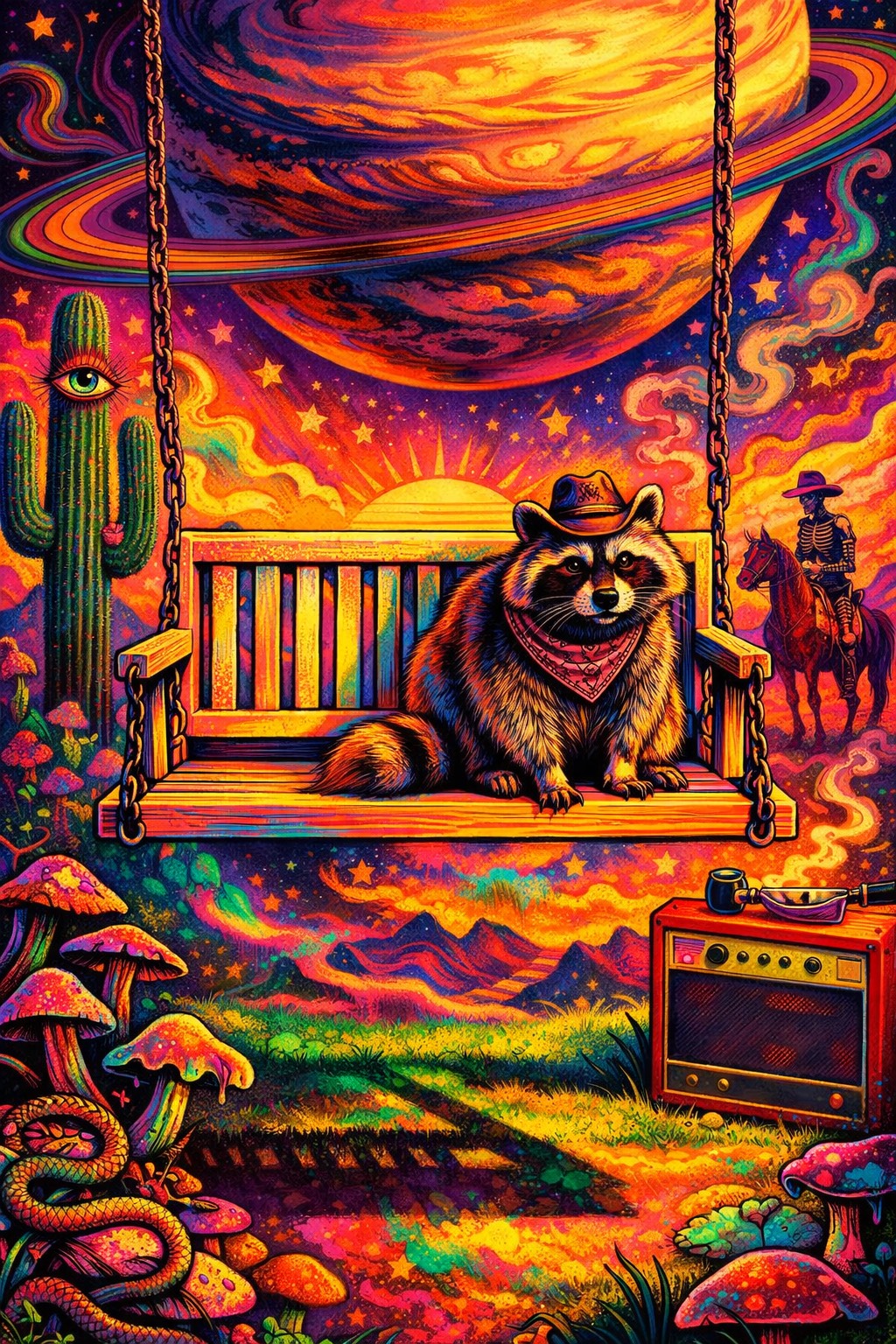 upbeat fastpaced outlaw acid country psychedelic outlaw country cosmic cowboy energy driving train rhythm twangy telecaster lead guitar fuzzy psychedelic electric guitar analog phaser effects cosmic pedal steel swells galloping outlaw country drums deep warm bass groove vintage tube amp tone spacey reverb swirling hammond organ textures dusty saloon energy mixed with psychedelic space western atmosphere energetic but mysterious sounds like Country, outlaw country, Americana jamming with a cosmic outlaw band in deep space