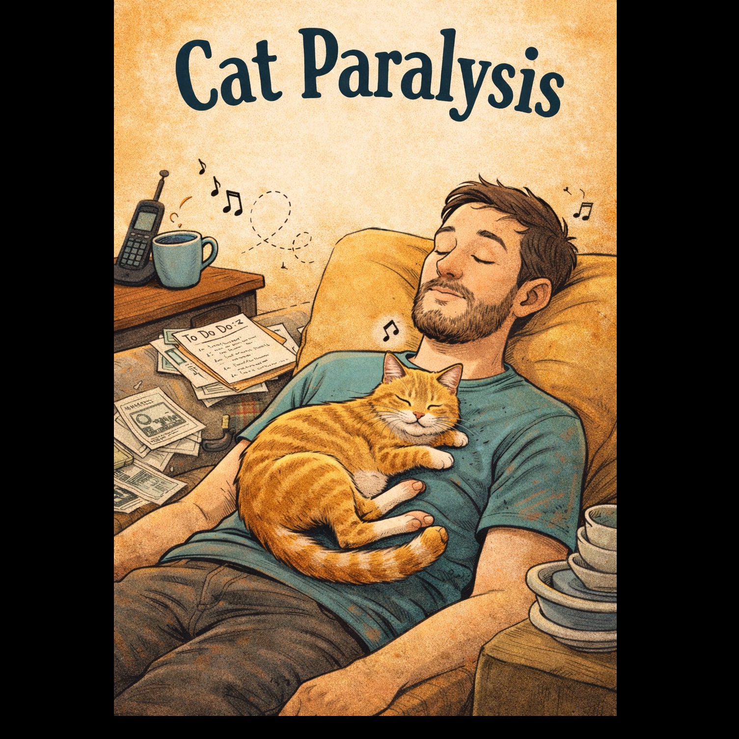 Lo-fi indie folk song, warm and quirky, gentle humorous storytelling vibe, relaxed coffeehouse atmosphere, slightly whimsical, Male vocal with laid-back conversational delivery, slightly deadpan but warm and charming, Instrumentation: soft finger-picked acoustic guitar, muted electric guitar with light tremolo, upright bass, brushed snare drum, light shaker percussion, subtle analog synth pads, occasional glockenspiel accents, Production style: lo-fi tape warmth, vinyl crackle ambience, soft room reverb, intimate close-mic vocal, cozy living-room recording feel, Tempo: slow-mid tempo (80–90 BPM), relaxed groove, Mood: cozy, funny, mellow, charming, indie storytelling energy, Think lazy Sunday afternoon with a cat asleep on your chest