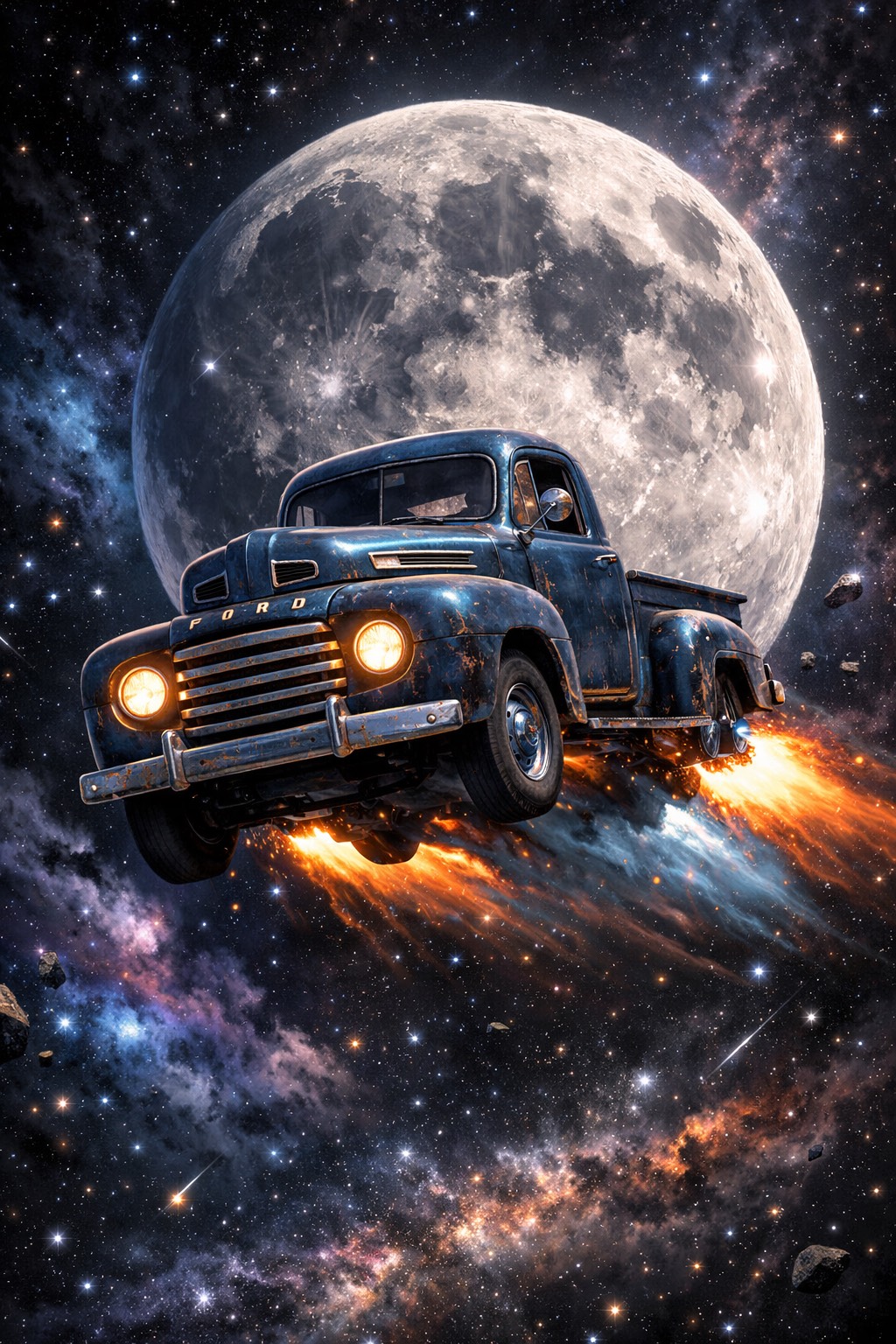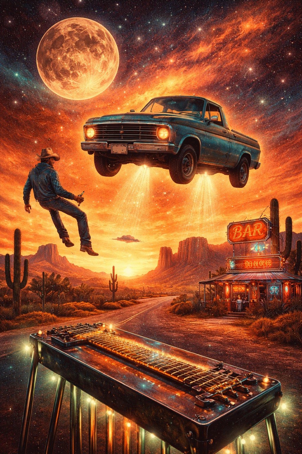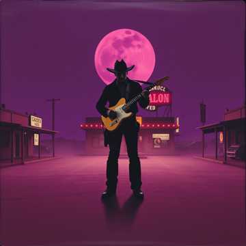 A mid-tempo outlaw groove at 92 BPM, anchored by a deep, roomy 70s kit and warm, overdriven bass locked into a pocket, Clean Tele twang rides with occasional fuzzed psychedelic leads, reverse reverb swells, and steel guitar swimming in reverb with a slow phaser, Atmospheric FX—space wind, reverse cymbals, faint UFO pad—add mystique, Vocals are a deep baritone, confident with slapback and double-tracked on the chorus, Bridge strips to steel and pads; final chorus returns everything full and immense