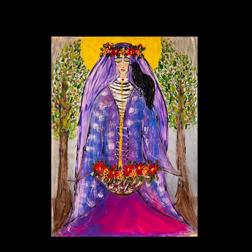 The piece unfolds at a slow tempo, with soft harp arpeggios and sustained strings weaving gentle layers beneath a calm female narration, Warm ambient pads and delicate wind textures subtly envelop the soundscape, crafting a mystical, contemplative mood with a sacred feminine presence