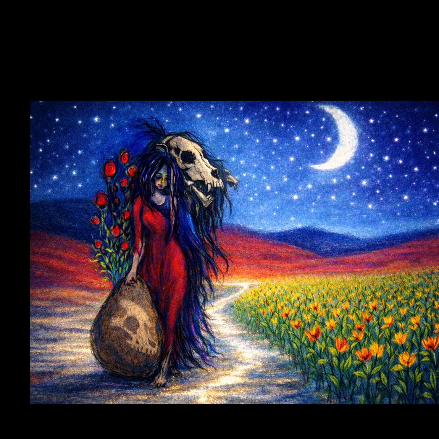 Spoken word meditation, warm feminine voice, slow calm delivery, mystical ambient desert soundscape, soft wind, frame drum heartbeat, subtle flute, ancient earthy atmosphere, spacious and immersive