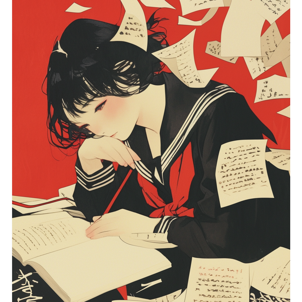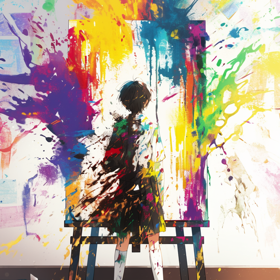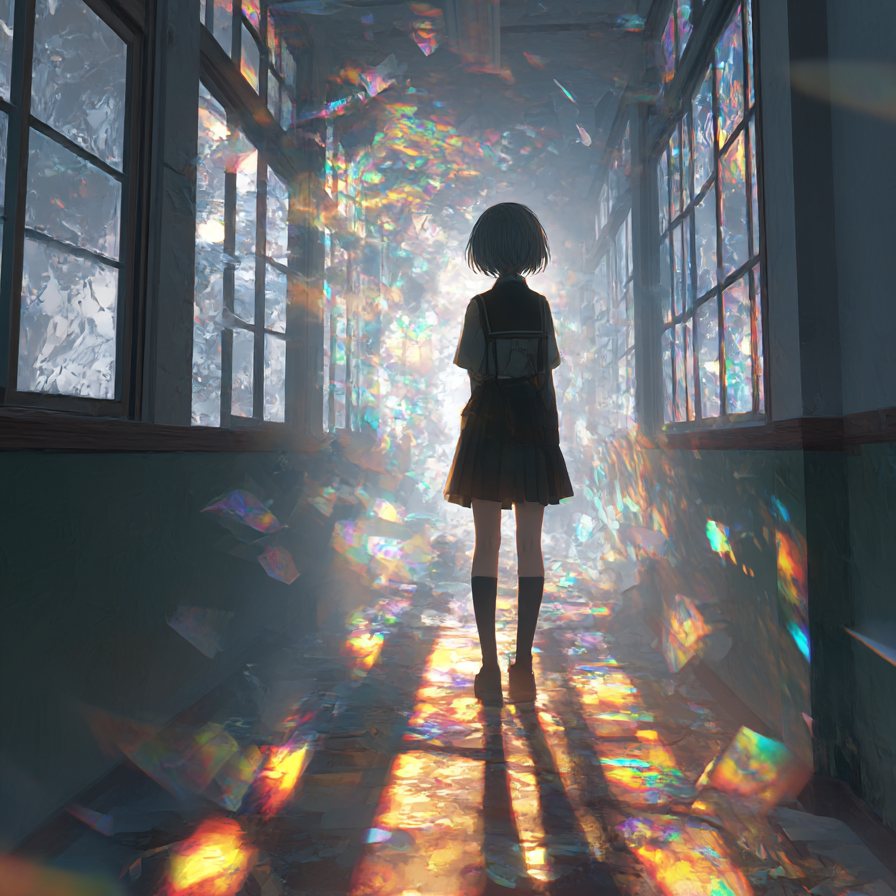 Shoegaze-influenced Japanese post-hardcore with minimal electronic textures, tempo 145 bpm, Female Japanese vocal only, fragile yet edgy delivery with airy highs, Verses use clean delay-driven guitars like faint pencil lines, surrounded by reverb for an empty classroom feel, Choruses explode with layered distorted guitars creating dense, colorful sound walls that blur like smeared paint, Drums are steady mid-tempo with wide crashes and syncopated snare accents, giving a sense of turbulence, Bass sustains distorted pedal tones, adding weight beneath shifting chords, Guitars alternate between delicate arpeggios and saturated chords, sometimes bending notes or sliding to mimic distortion of colors, Electronics add glitch textures, filtered white noise, and reversed tones that bleed like paint spills, Recurring two-bar riff between guitar and synth returns with greater density each time, symbolizing layers of paint stacking, Mood is vivid yet unstable, portraying teenage emotions