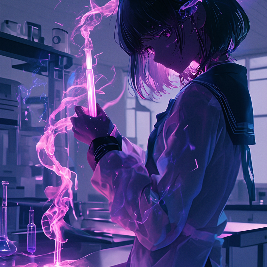 High-energy Japanese post-hardcore with glitchy electronic textures and Vocaloid song and hyperflip and techcore and djent, tempo 160 bpm, Female Japanese vocal only, intense and theatrical, with strong chest voice and powerful low-to-mid range, Verses are dry and mechanical, using staccato phrasing with layered whispers for robotic effect, Choruses explode with wide distorted guitars and vocal doubles, emphasizing vowel-forward hooks, Drums feature rapid double-kick bursts, syncopated fills, and abrupt breaks that mimic unstable reactions, Bass is heavily distorted, driving with pick attack, creating low-end turbulence, Guitars alternate between palm-muted chugs, angular unison riffs, and dissonant slides, while synths provide glitch stutters, distorted bursts, alarm-like risers, and filtered sweeps to mimic lab chaos, Recurring two-bar riff of guitar and synth builds intensity like a chain reaction spiraling