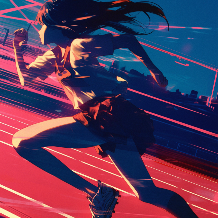 Fast Japanese post-hardcore with math rock precision, tempo 160 bpm, Female Japanese vocal only, sharp and emotional, alternating shouted bursts, rapid phrases, and soaring belts, Verses are tight and percussive with dry vocals, palm-muted guitars, and minimal synth glitches, Choruses explode with layered distorted guitars, octave leads, and doubled vocals for maximum lift, Drums are relentless: tight snare, syncopated kick bursts, rolling tom fills, and constant forward drive like sprinting footsteps, Bass is pick-driven, distorted, locked tightly to drums, adding turbulent low-end, Guitars deliver angular unison riffs, sudden tritone slides, and harmonic dissonances, then break into wide open chords for contrast, A recurring two-bar guitar+synth motif races forward each cycle, intensifying with added layers to mimic building speed, Electronics are minimal but cutting, with glitch stutters, risers, and digital noise fragments reinforcing error and struggle imagery