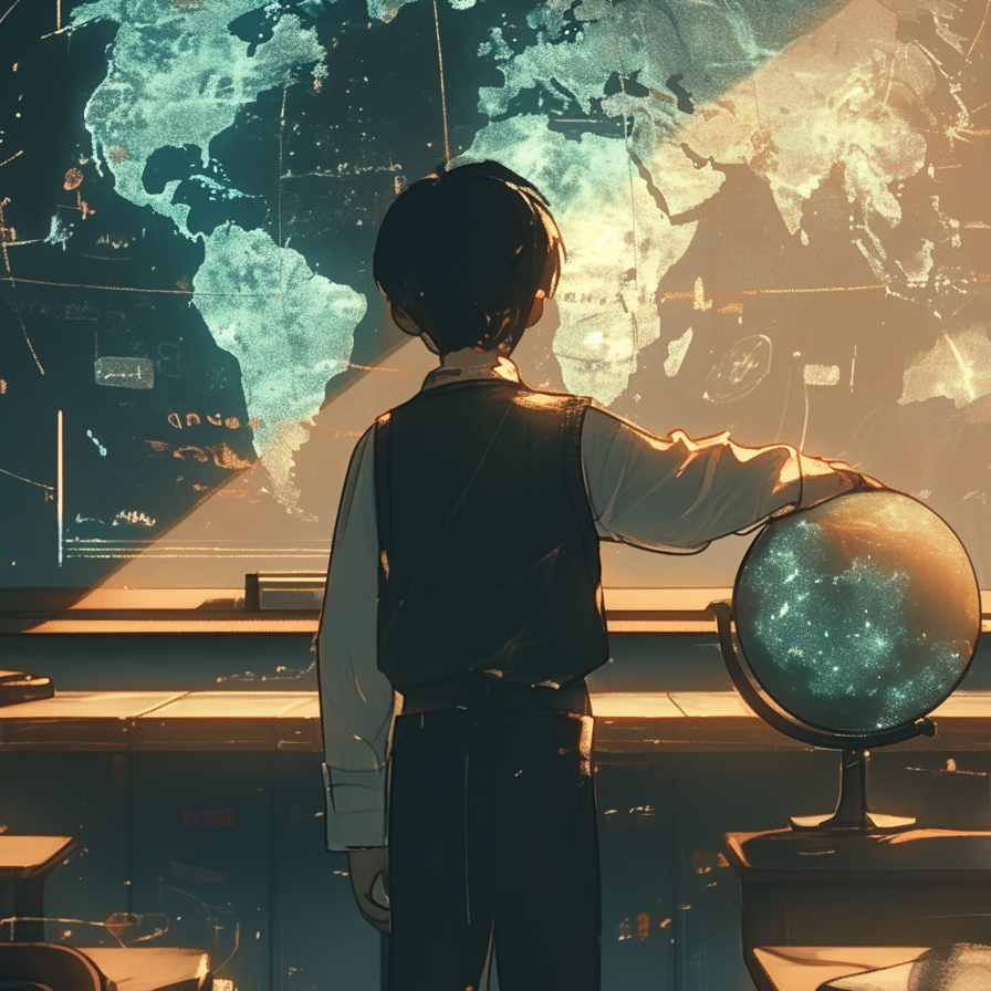 Mid-tempo Japanese emotional post-hardcore with post-rock influence, tempo 128 bpm, Female Japanese vocal only, emotional and restrained, moving from whisper-like phrases in verses to soaring belts in choruses, Verses use clean guitar arpeggios with delay and reverb, creating spacious atmosphere, Choruses expand into layered distorted guitars and wide ambient textures, evoking warped map projections, Drums are steady with syncopated toms and dynamic crashes, giving rolling motion, Bass provides sustained distorted low tones, grounding harmonic shifts, Guitars alternate between delicate arpeggios, saturated chords, and tremolo-picked lines for tension, Electronics add subtle glitches, filtered sweeps, and static noise to symbolize cartographic distortion, A recurring short guitar+synth motif repeats and grows denser, like redrawing the same map in different projections, Mood is expansive, melancholic, and reflective, portraying teenage struggles with identity and belonging