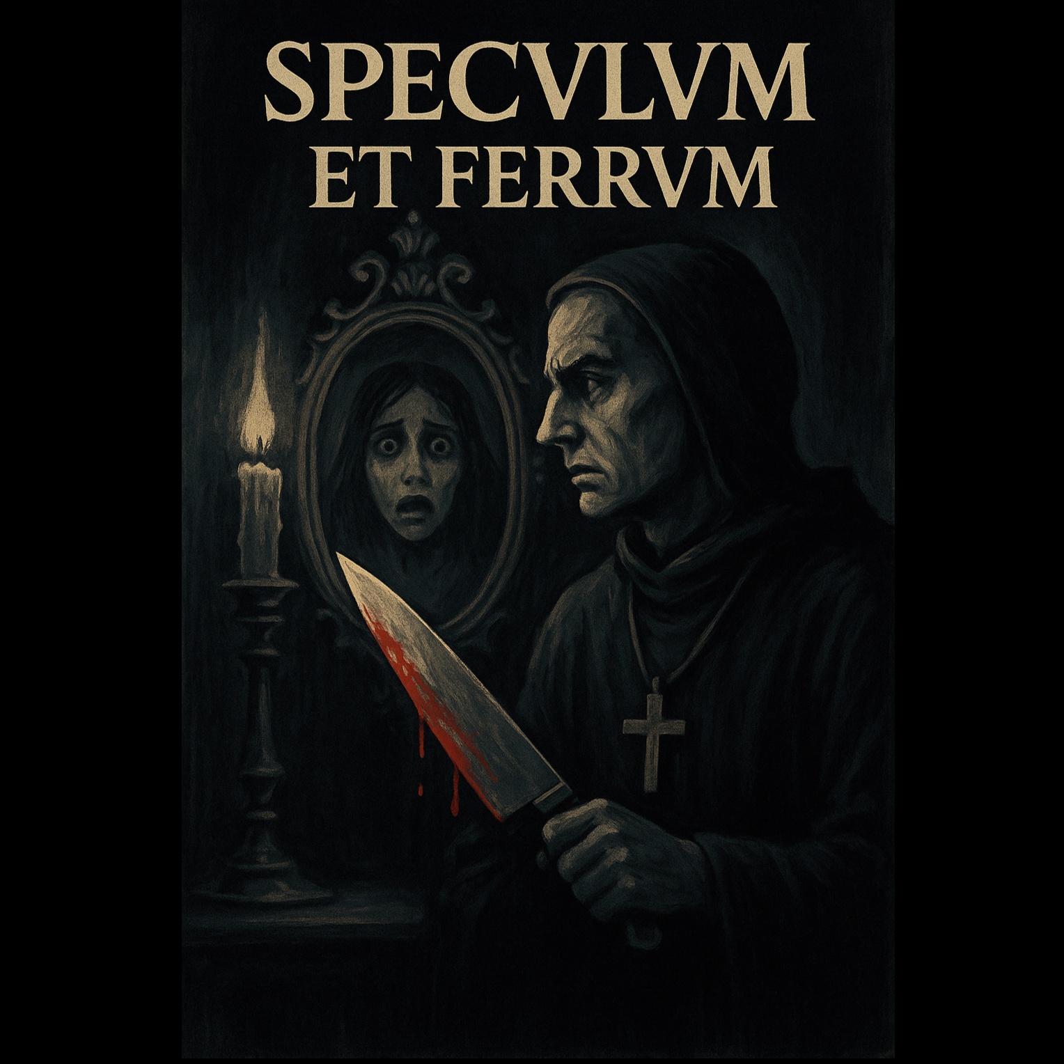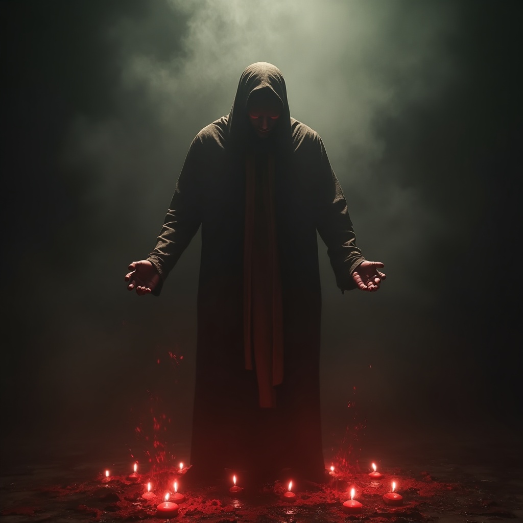 Dark ambient ritual music at 55 BPM, Gregorian-style chants in reverse, deep throat drones, rustling fabric textures, distorted tape hiss, bowed cymbals, ritual percussion, echoing footsteps in cavernous reverb, low-frequency vibrations, possessed whispers and reversed vocals, designed to evoke dread and subconscious fear