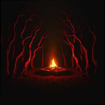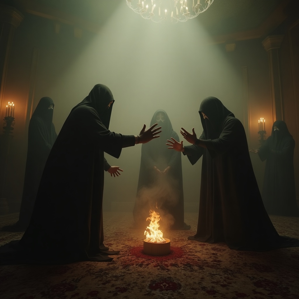 A slow-burning psychological horror track at 40–60 BPM, with eerie drones, detuned piano, and ritual pulses, Creaking strings, bowed metal, and unnerving cello harmonics build the main motif, Distorted ritual drums, reversed layers, whispered incantations, crackling fire, and glitched female vocals evoke occult ritual, Analog hiss, forest ambience, and tape warble add haunted depth, Quarter-tone bends, sudden silences, and swelling dissonance heighten unease, Crescendo unleashes chaos—screaming strings, demonic bursts, distortion—then abruptly drops to ghostly echoes