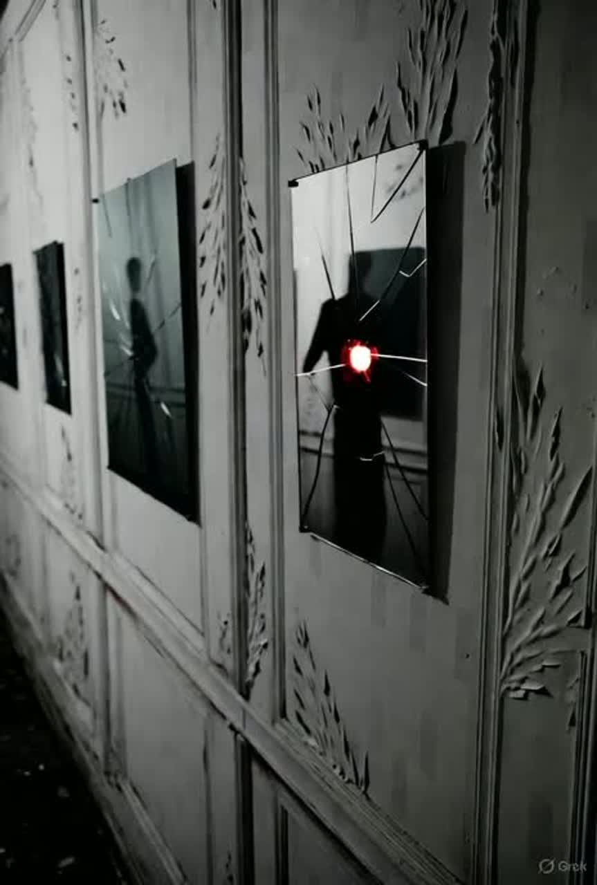 Cinematic horror / dark ambient at 68 BPM – unnerving, suspenseful, psychological tension, Strings (violin, viola, cello) with dissonant clusters and slow glissandi, Detuned drones and low rumbles form a suffocating foundation, Distorted radio static creates ghostly textures, Reversed piano notes and metallic scrapes deliver unpredictable fear stabs, Whispered vocals and processed number sequences (7…4…9…) cut through the mix, Faint ticking and static pulses evoke number stations, Bowed metallic percussion and waterphone accents heighten dread, Subtle choral swells (breathy, almost inhuman) rise and fade, Moments of near-silence amplify tension before sudden bursts, 4/4 time, C minor with chromatic dissonance and unresolved intervals, Immersive wide stereo contrasts silence with explosive sound, Designed to evoke an Insidious-style, terrifying, otherworldly atmosphere