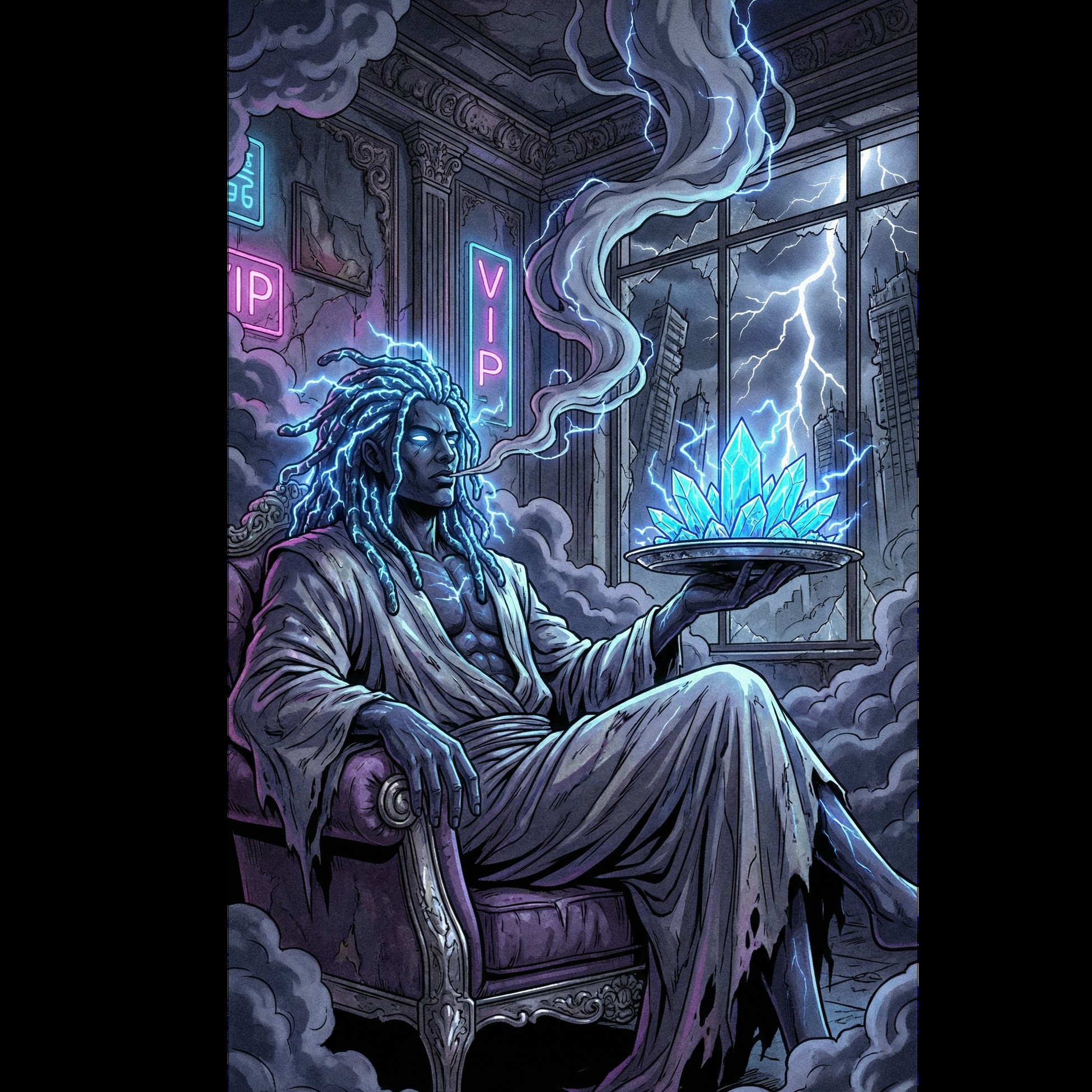 Final polished dark ritual dub reggae track, divine and oppressive atmosphere, perfect balance of space and weight, heavy sub bass with controlled dynamics, slow tempo, three guitars precisely layered (cinematic dub feedback guitar, disciplined black metal tremolo guitar, intentional chaotic noise guitar), ritual trumpets used sparingly for impact, commanding raggamuffin / raw rap lead vocal, massive but restrained “100 voices” ritual backing vocals, storm ambience, cinematic, hypnotic, godlike authority, album-opening statement, remix-ready but complete