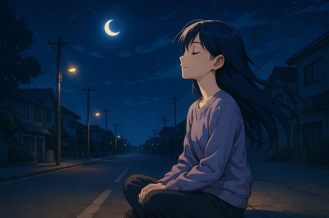 soft female voice, lofi chill, soft beats, mellow bass, warm guitar or piano, ambient sounds like night wind or crickets, calm