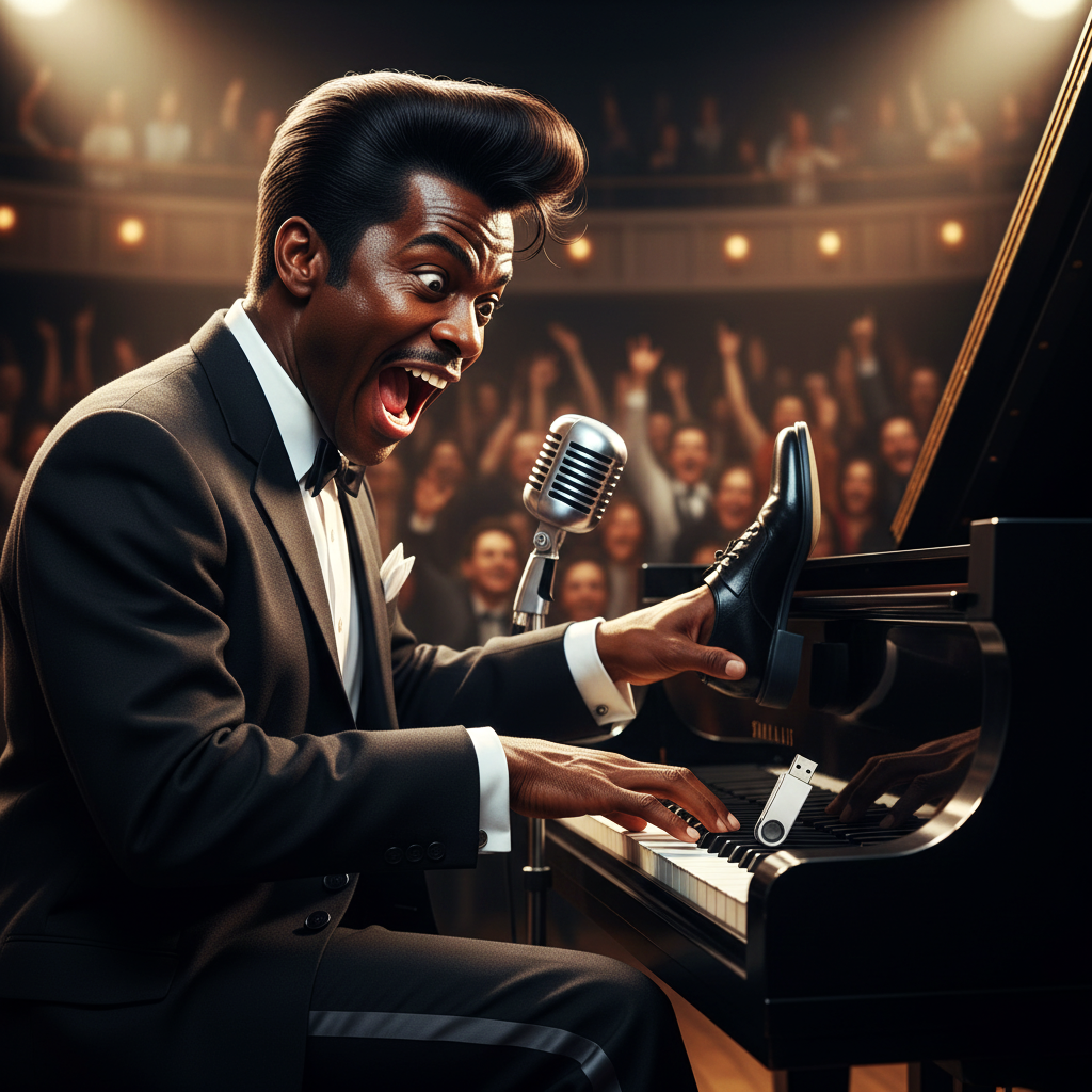 Little Richard lead vocals, powerful, raspy, dynamic, screaming, a unique blend of gospel fervor boogie-woogie and rock and roll intensity, wild and over-the-top, frantic piano driven high-energy 1950s rock ‘n’ roll style, Exaggerated shouting, wailing, playful “woo-ohs” and “ahhhs, ” rapid-fire phrasing, raspy and slightly gritty voice with falsetto bursts, Call-and-response background vocals with “hey-yeahs” and “woo-ohs” for effect, Classic 1950s rock ‘n’ roll / early rockabilly style, Up-tempo shuffle rhythm, Booming piano with fast, playful runs and occasional glissandos, snappy snare, upright or slap bass, twangy guitar riffs, energetic boogie piano with fast runs, occasional cymbal crashes, Catchy, Memorable