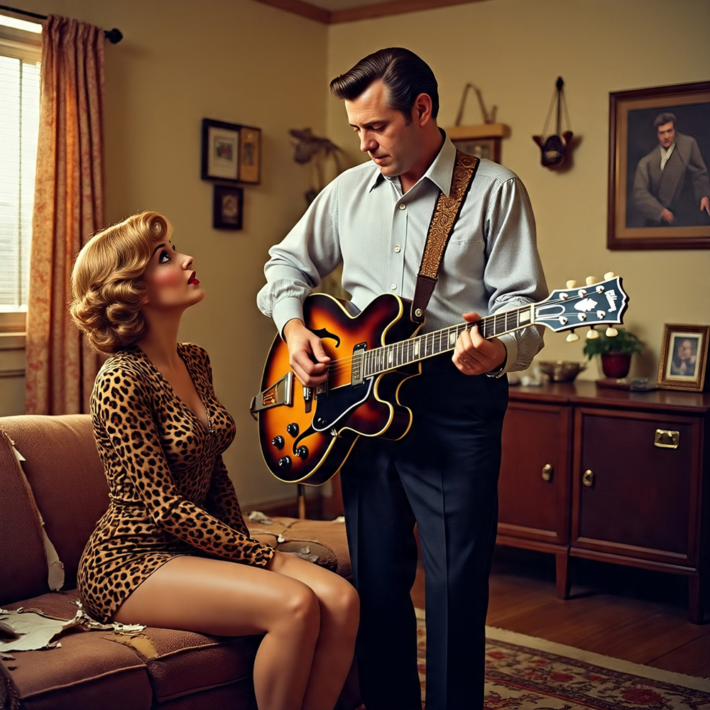 Carl Perkins lead vocals with a playful, raw, earthy, raspy twang, lots of energy and humor, honky-tonk roots, occasional hiccup-style phrasing, delivered with a vintage 1950s rockabilly swagger, Backing vocals are light and shouty “call and response” style in the choruses, Instrumentation features bright, twangy electric guitar with sharp rockabilly licks, upright slap bass with percussive popping, and a snappy drum kit with strong snare backbeat and light ride cymbal, Tempo should be upbeat and danceable, with a raw, live feel that captures the Sun Records-era rock ’n’ roll sound, Overall vibe is fun, bouncy, and mischievous, perfect for a humorous, innuendo-filled rockabilly number, Catchy, Memorable