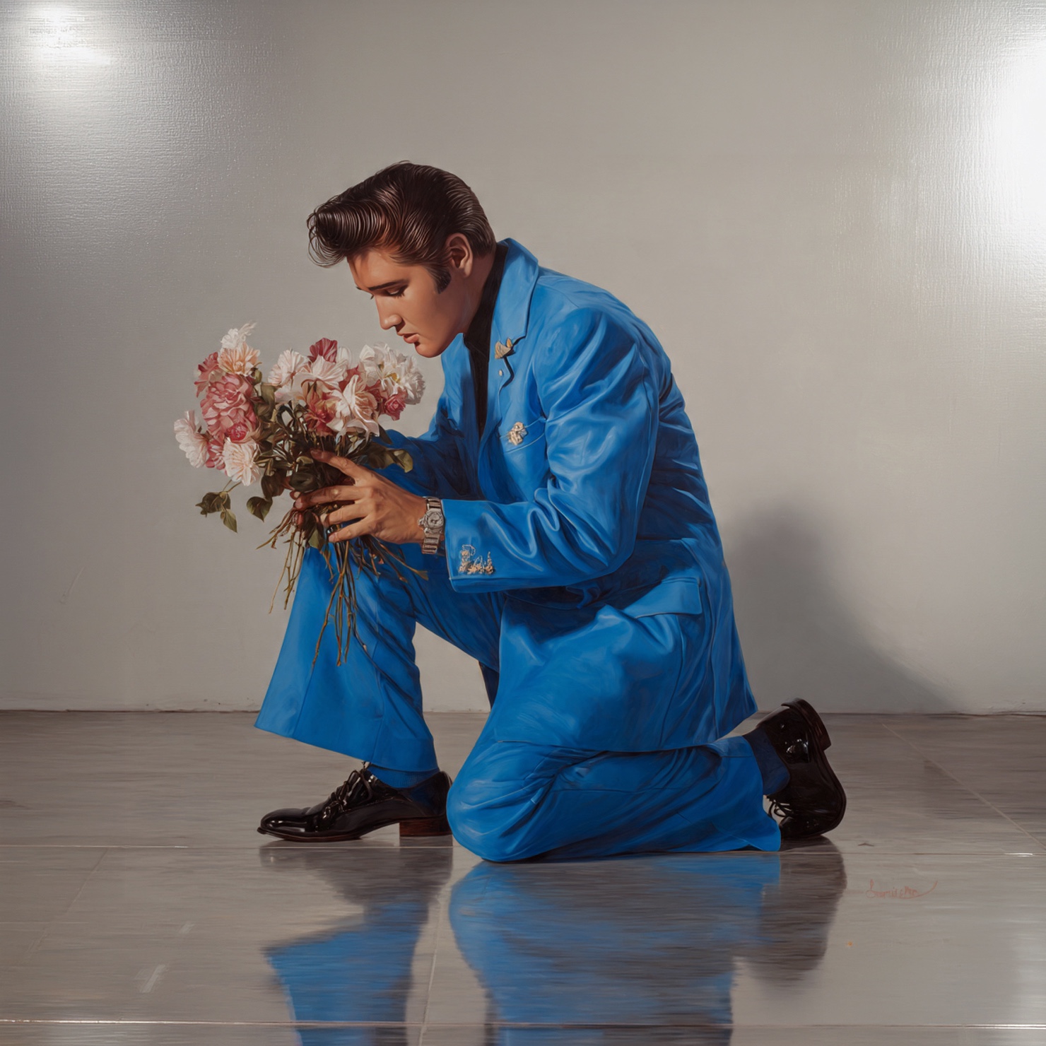 1956 melancholic male rockabilly ballad with dramatic crooning vocals and gospel-style backing harmonies, Inspired by classic RCA Records-style production, pulsating, mid-tempo romantic ballad that blends early rock and roll with country and pop influences, Lead rockabilly singer with a rich, tender, melodic performance, emotional voice—think early rock 'n' roll heartbreak, Backed by smooth male vocal group with ‘doo-wop’ and ‘ooh-ahh’ style harmonies, Upright bass, slapback echo on vocals, gentle piano, and slow bluesy swing groove, Long intro, Melodic, catchy, memorable