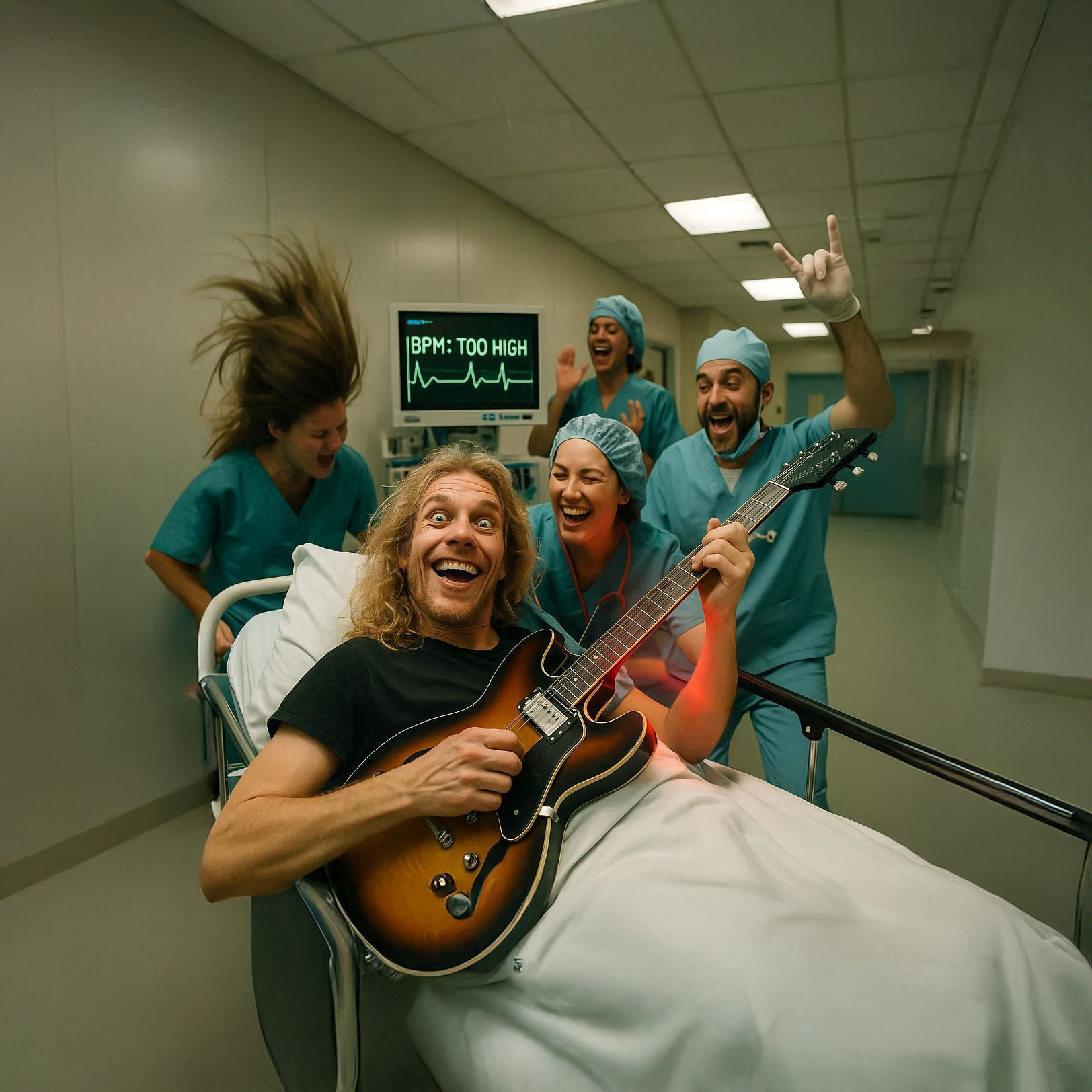 Fast, Intense, rocking, guitar-driven pub rock & early power pop with a rootsy rock ’n’ roll energy, Bright, overdriven rhythm guitars with tight, percussive strumming and short, twangy lead licks, Bass is melodic, walking, & punchy, locking tightly with a snappy snare-driven drum groove, Driving backbeat that feels live and urgent, Drums should sound natural and dry, close-mic’d, with crisp hi-hats and a solid kick, Include occasional rockabilly or 1950s R&B touches — quick guitar fills, a touch of boogie boogie piano for texture, Male vocal is confident, cheeky, and expressive, with a slight rasp and British-influenced phrasing, Clever everyman storyteller, The delivery should have a playful swagger, slightly ironic but still warm and musical, Occasional harmony background vocals, Keep harmonies tight and natural, this song should rock, Lost of hooks, melodic, catchy memorable