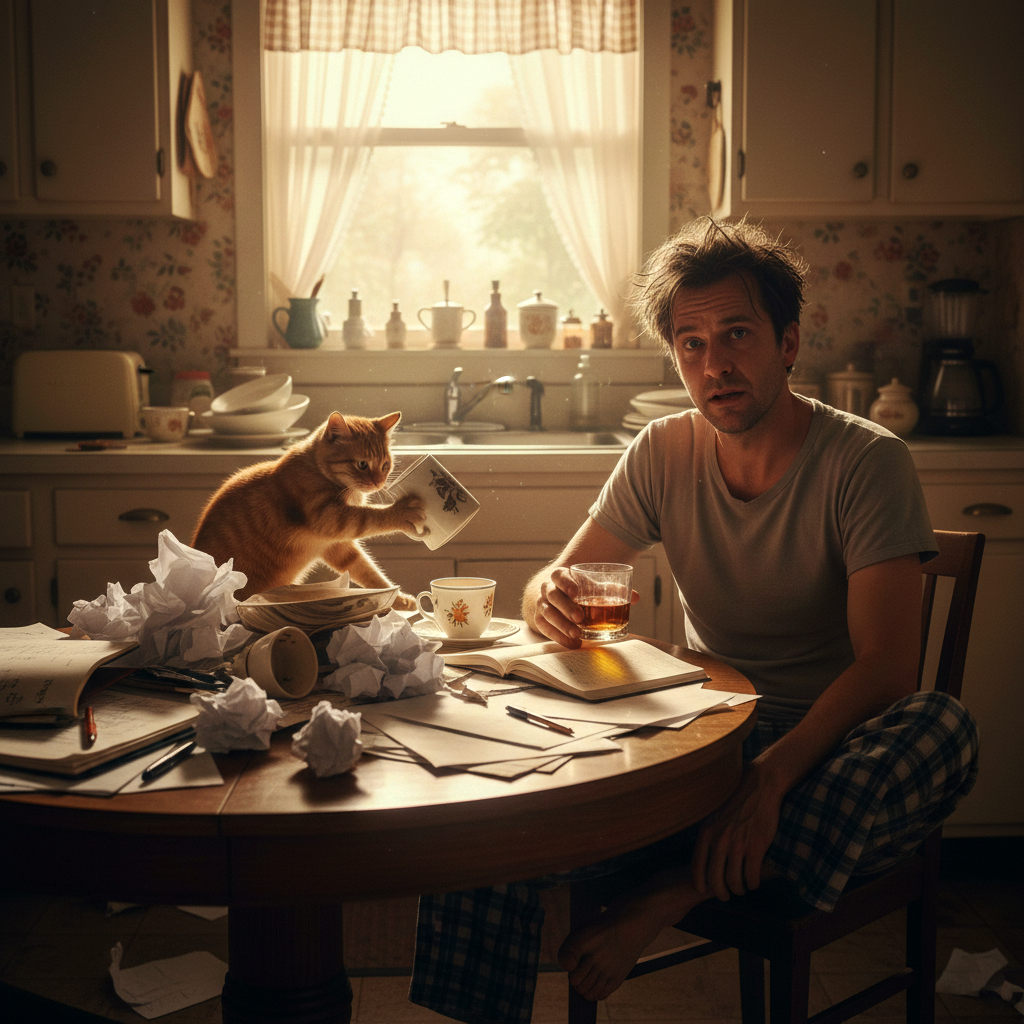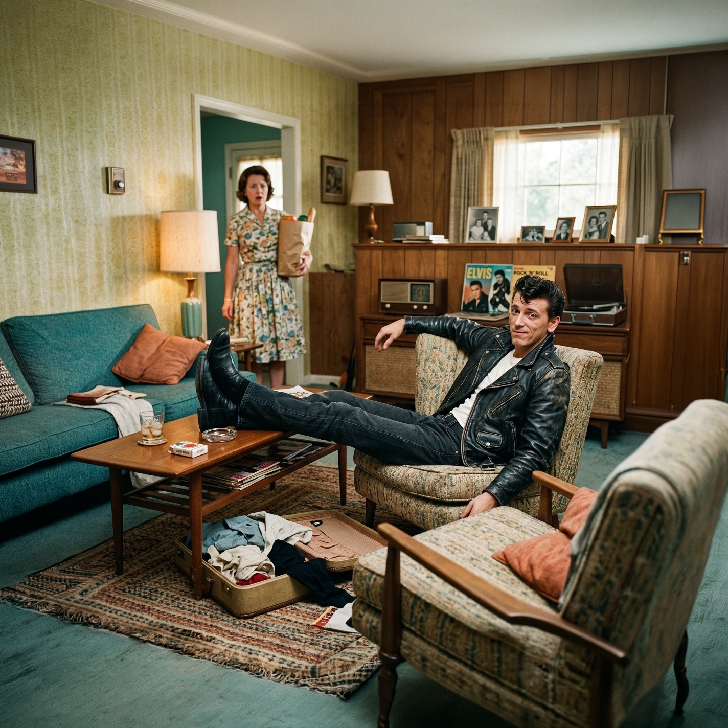 Uptempo, energetic country-rock & rockabilly-inflected song with a humorous, storytelling style, Twangy electric guitar, steady acoustic rhythm, subtle pedal steel accents, & a relaxed, confident, conversational male vocal, Emphasis on witty lyrics, playful timing, & a light-hearted, ironic tone, Drums & bass provide a steady 1050’s inspired groove that supports the storytelling without overpowering it, Lots of hooks, melodic, catchy, memorable
