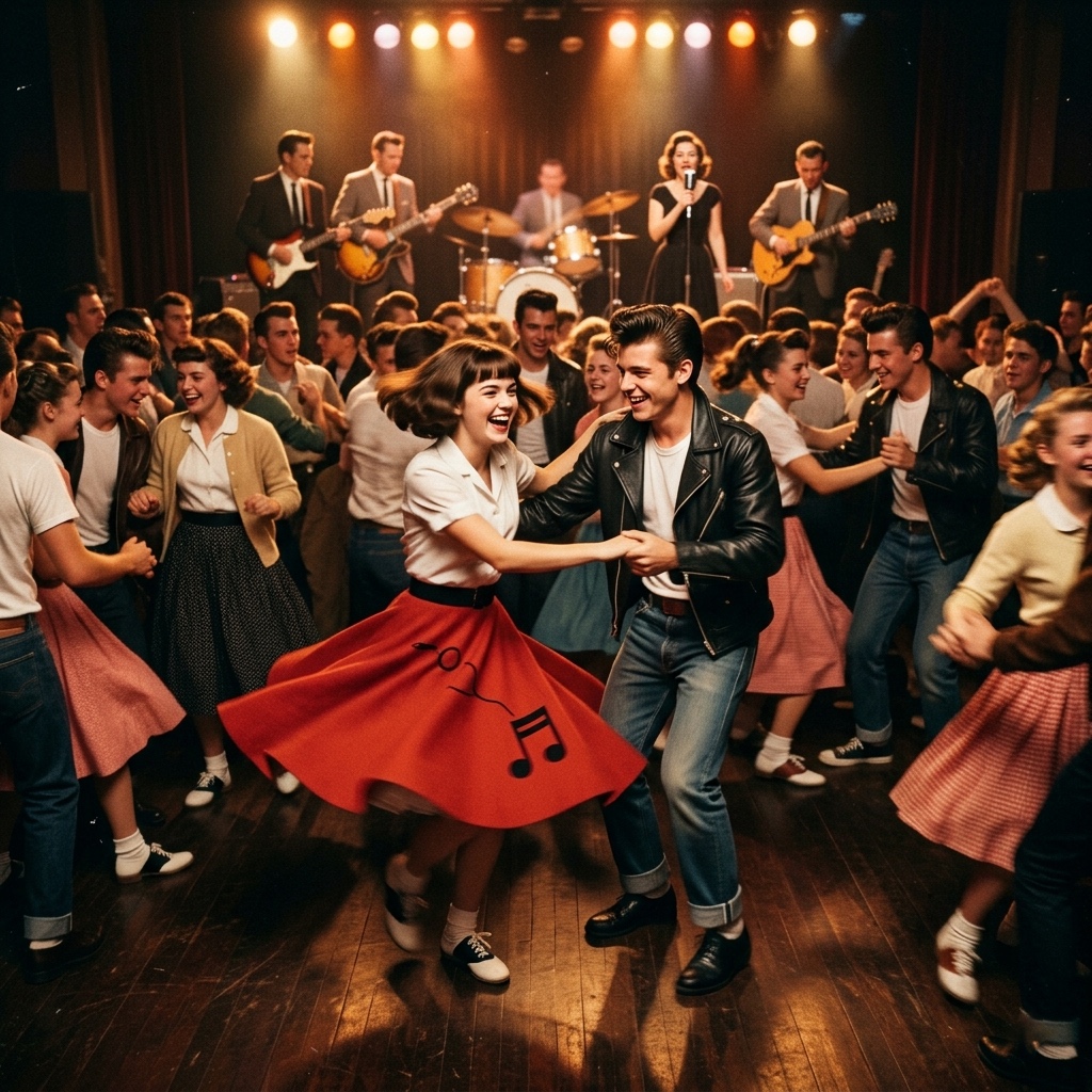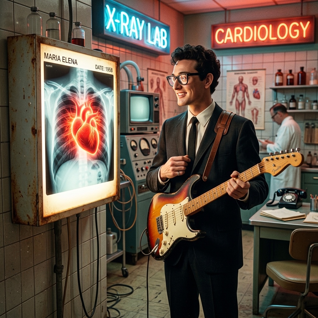 1950’s energetic, high-tempo rock & roll classic blending rockabilly, country, & rhythm and blues, male “hiccup" clear vocals, driving guitar riffs, urgent melody, features a fast, enthusiastic sound with backing vocal harmonies, Fender Stratocaster electric guitar, walking bass, boogie-woogie piano, features sharp, driven guitar work & a fast-paced, "heartbeat" rhythm, Celebrates youthful, joyous, & reckless love, lots of hooks, long intro, catchy, melodic, memorable