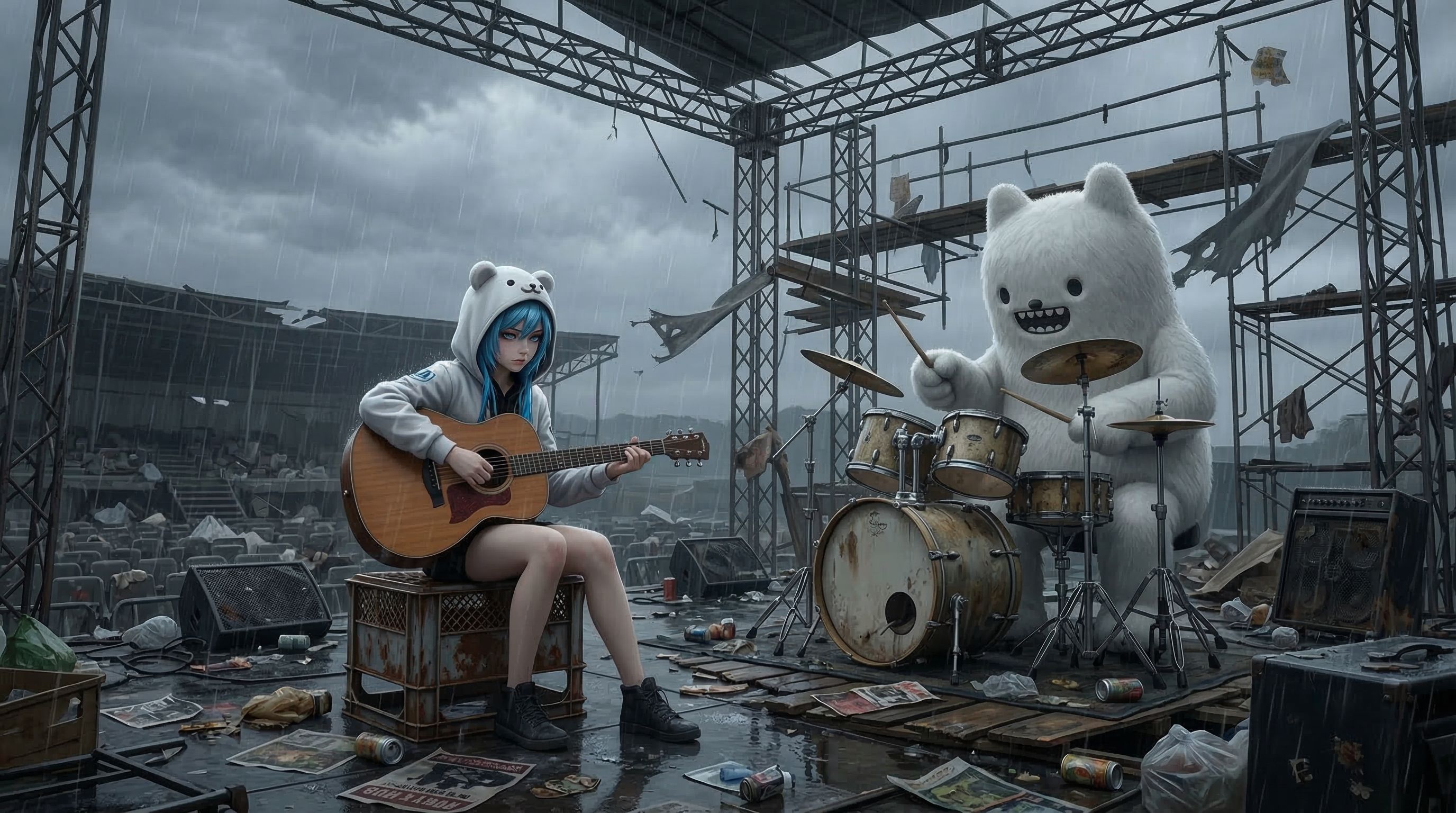 Minimal acoustic indie arrangement using only acoustic guitar, drums, and storm ambience, The scene feels like a lonely live performance during a violent storm, as if playing on an empty outdoor stage in the middle of a heavy downpour, The acoustic guitar is the main instrument, with rhythmic strumming, steady downstrokes, and occasional muted percussive hits, Natural, slightly resonant tone carrying the harmony and groove, Drums are simple but firm with a steady 8-beat groove, soft kick and snare, minimal fills supporting the guitar without overpowering it, A strong storm atmosphere surrounds the music: heavy rain hitting the ground and stage, powerful wind rushing through the space, and distant thunder and occasional lightning strikes, These natural sounds create a dramatic, immersive environment, Vocals are soft female indie vocals, intimate yet emotional, contrasting with the intense storm, Sparse arrangement, natural dynamics, raw live feeling, dramatic and melancholic mood, 🌧️🌪
