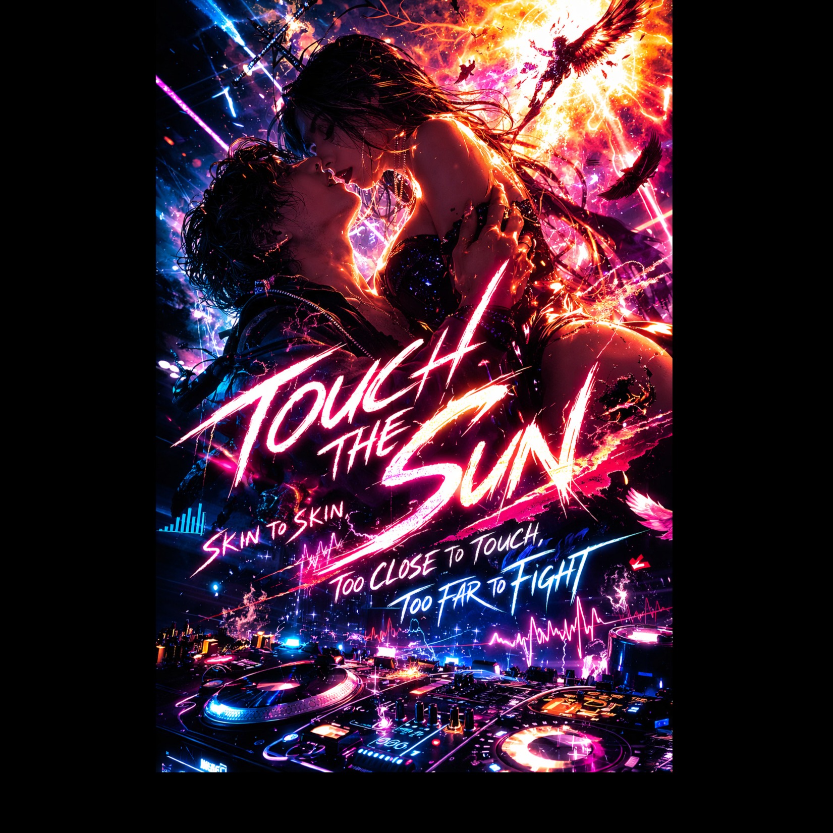 Explosive future-facing cosmic club pop / electro-house cover remix, 126 BPM, minor key, smooth seductive tenor lead vocal, tightly controlled and slightly pitch-processed, dangerous sensual night energy, hard verse-to-drop contrast, syncopated punchy sub-bass, crisp 4/4 drums, sharp claps, bright hi-hats, aggressive distorted staccato synth lead, filtered pads, rising arpeggios, strong sidechain motion, cinematic tension builds, chopped vocal fragments, vocoder chants, inhuman vocal morphing, phoneme-sliced chants, impossible stereo swarm, time-warp blackout before the final drop, futuristic neon atmosphere, clean wide stereo mix, elegant but reckless, DJ-built, memorable, high impact, “Touch the Sun” as the signature hook